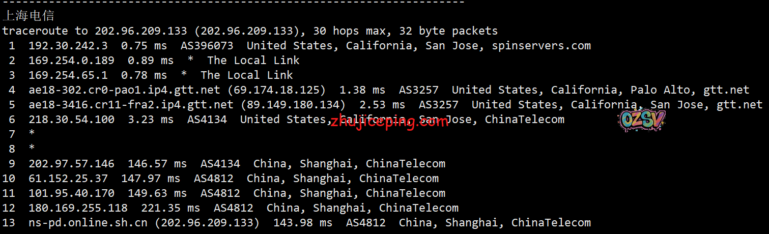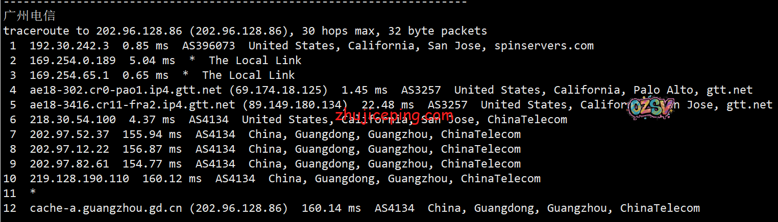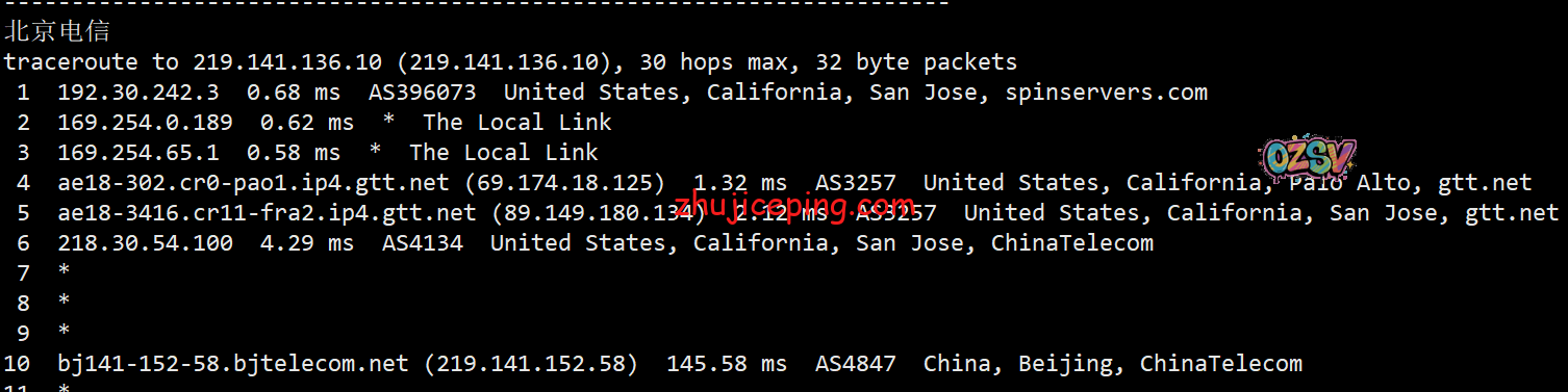 回程,到国内电信:机房出来走GTT到电信在圣何塞的节点,然后直连回国