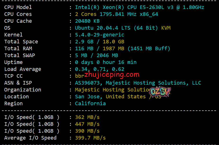 当前试运营用的CPU是e5-2630l v3,根据官方的说法后面上的都是高很多的CPU。当前硬盘I/O大致在400MB/s的样子,站长开启了BBR:
