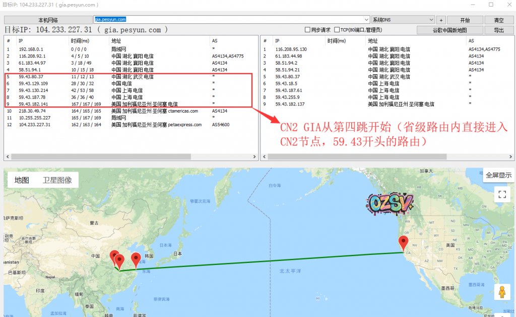 2、下图是美国圣何西CN2 GIA线路,以美国CN2 GIA线路的 IP 104.233.227.31为例,襄阳电信追踪美国CN2 GIA的IP,中国大陆内的行程为:襄阳-武汉-上海,即下图中的5-8跳全部是省级路由,省级路由全部由59.43的CN2节点承载与传输,在省级路由中没有任何202.97的163节点,省级路由直到进入美国之前,全程是59.43开头,直到进入美国后才结束,这就是典型的CN2 GIA线路,请见下图