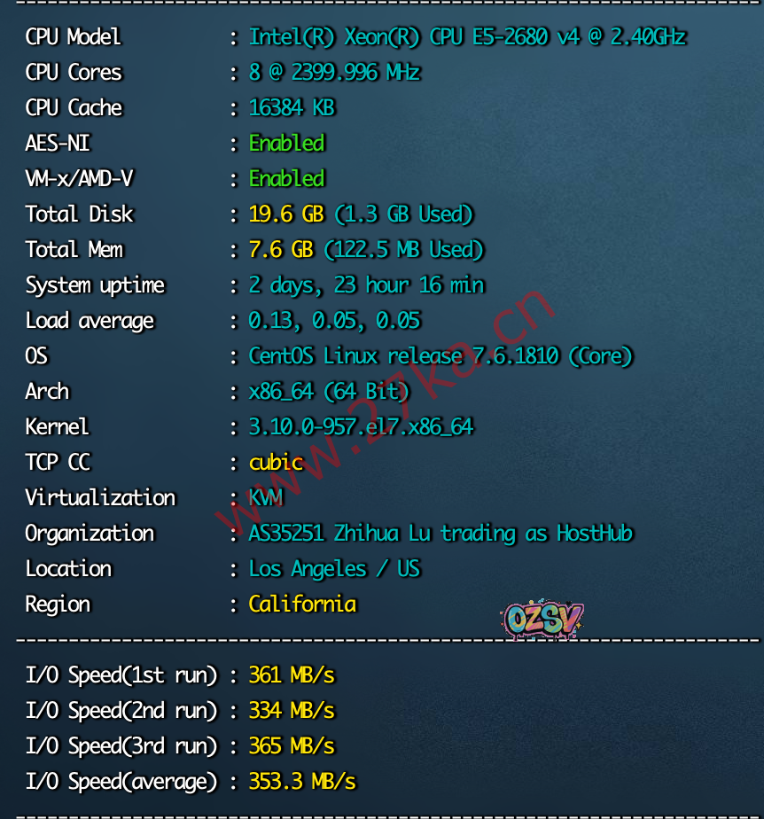 站长弄了一台美国高防的服务器,官方说的是20Mbps带宽。拿到机器,CPU为E5-2680v4,测试硬盘I/O在353MB/s的样子: