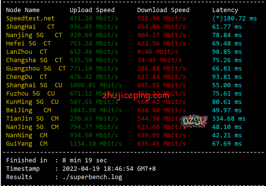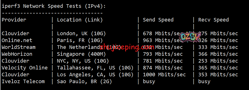 官方说的服务器默认是10Gbps带宽,然后最低配置的VPS给的是1Gbps,我们来跑一下看看小鸡的上、下行带宽能到多少吧。这里分不同的时间段测试,尤其注意对比白天和晚高峰的不同。大家注意看。说明下:第一个节点speedtest.net这个是选取的就近节点,但是由于我们的小鸡是美国原生IP,所以这个就近节点就是美国的了,所以测试出来的效果实际上有差距的。