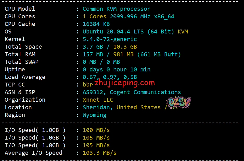 CPU具体型号不知道,大致2.1GHz主频,美国cogentco的原生IP,硬盘I/O大致103MB/S: