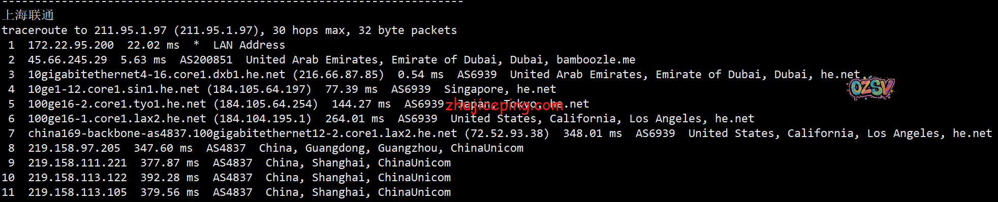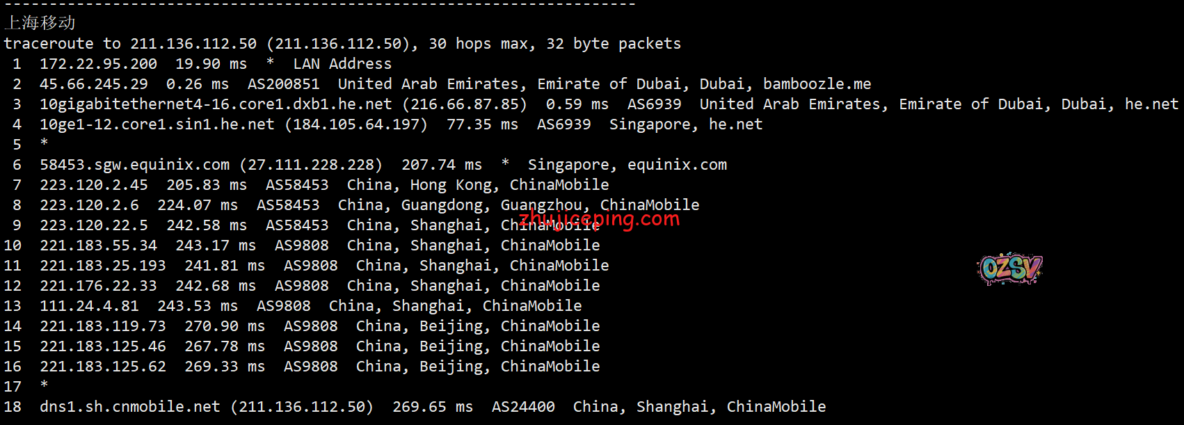 上海方向:迪拜走HE到新加坡,然后直连移动香港节点,接着回来