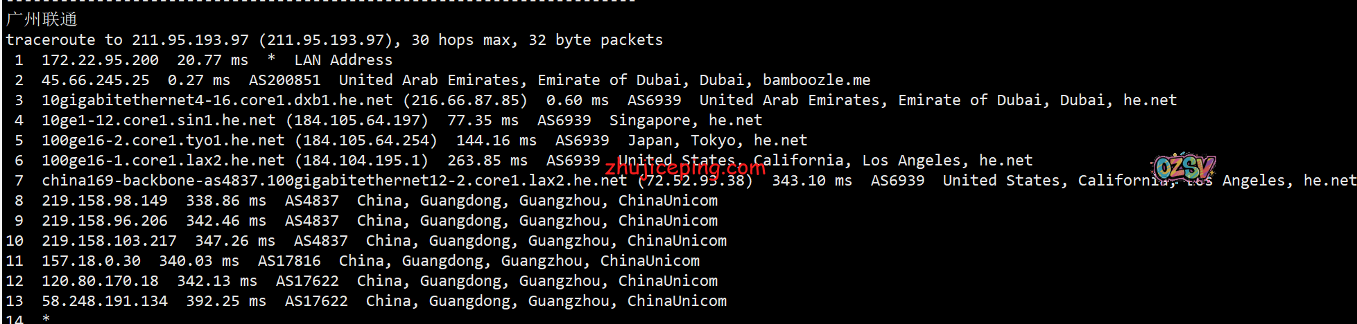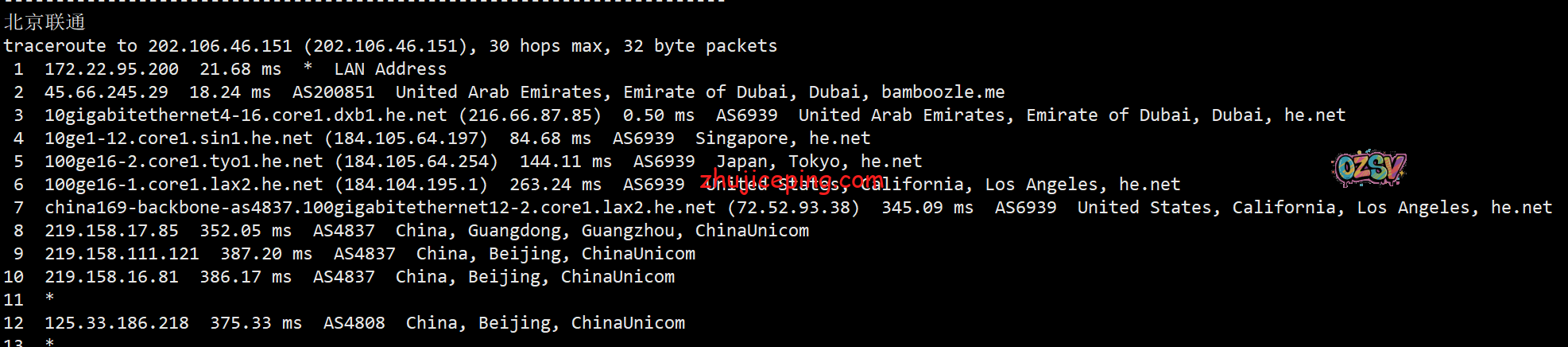 回程,到国内联通:走HE,先到新加坡,然后去日本,接着倒转回美国洛杉矶,然后AS4837回中国