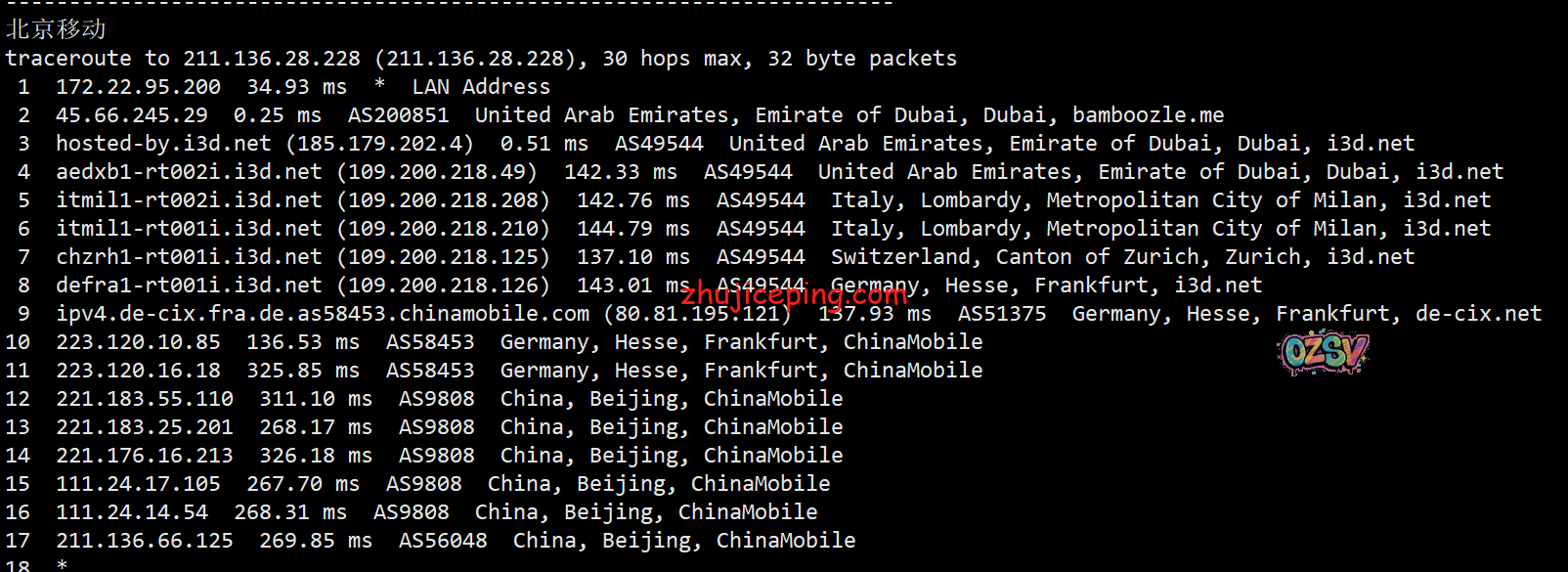移动去程,CMI国际直接接德意志商业互联网交换中心后再转了几下再回迪拜: