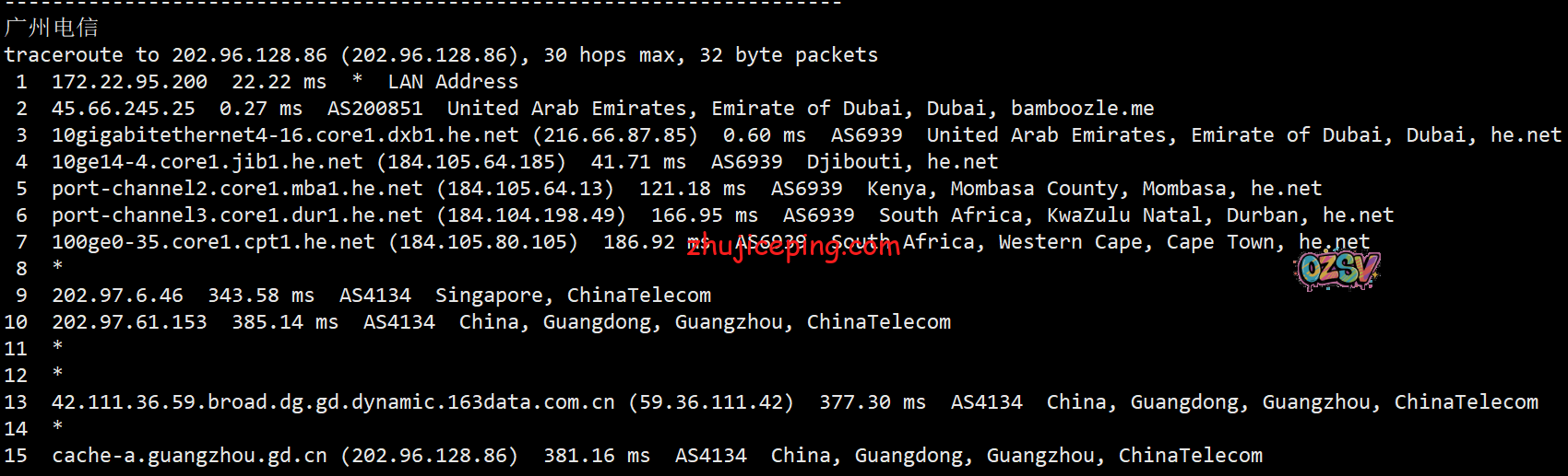 广州方向:从迪拜出来绕道去了非洲肯尼亚,然后又绕回来到了电信新加坡节点,然后回国