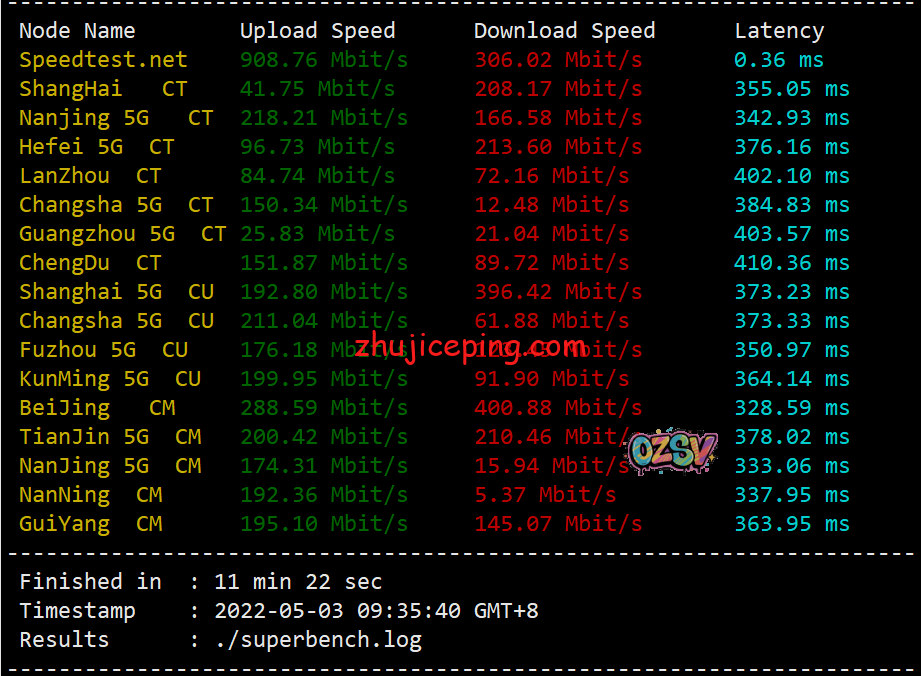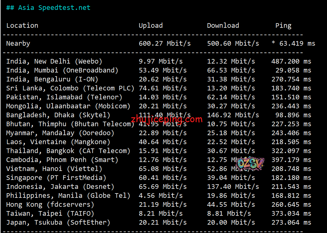 speedtest.net测试下带宽可以跑到多少,第一个就近节点大致可以看出1Gbps带宽是没问题的。其余国内三网节点变化就比较大了,整体来看联通和移动的效果比电信的好: