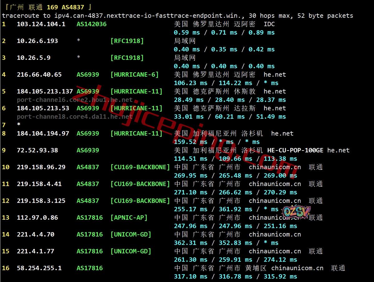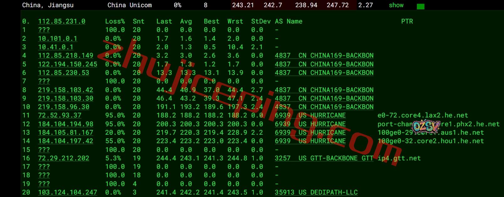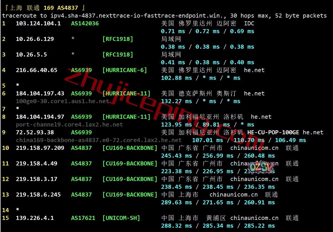 联通去程:直连联通洛杉矶节点,然后走HE.NET去东南方向