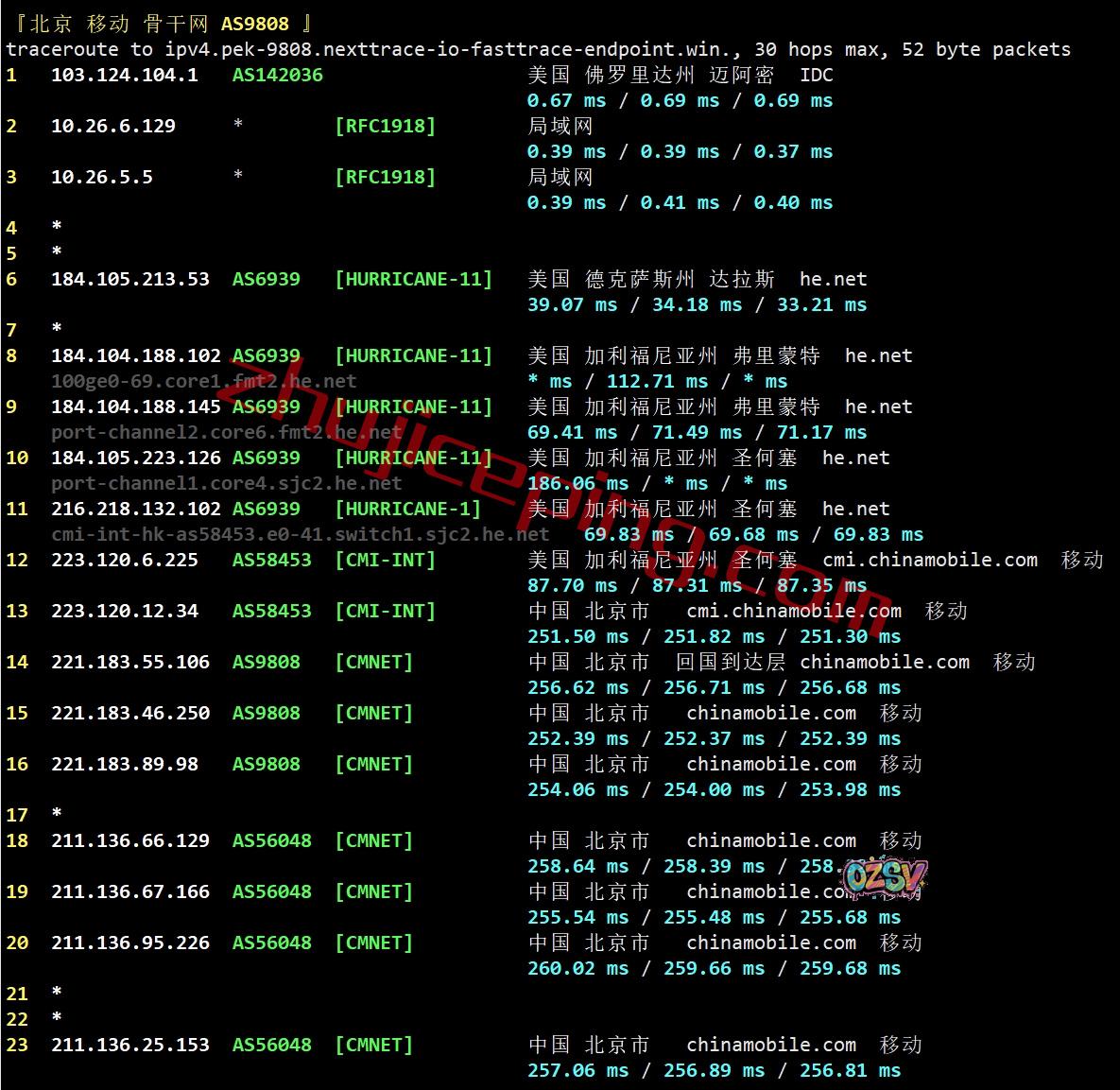 北京方向:走HE到圣何塞,从移动CMI圣何塞节点直连回国