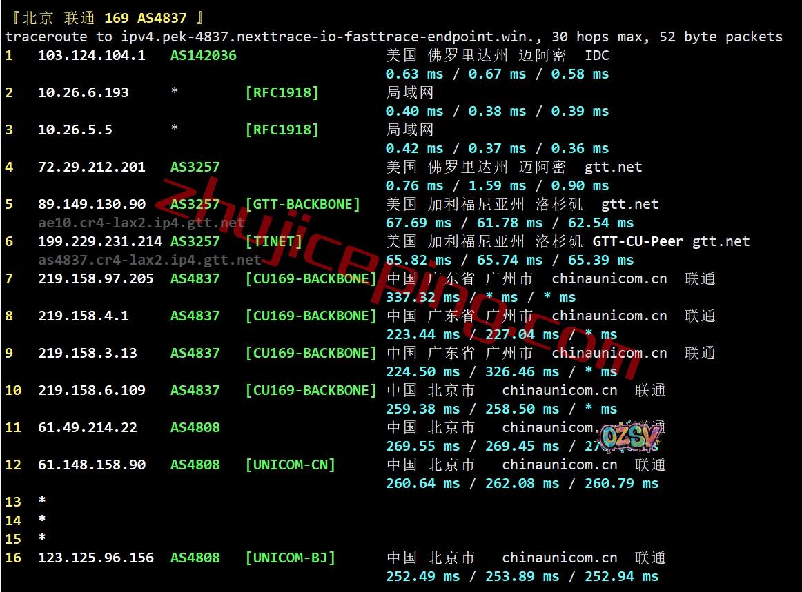 北京方向:走GTT到洛杉矶,从GTT与联通在洛杉矶的peer出来直连回国