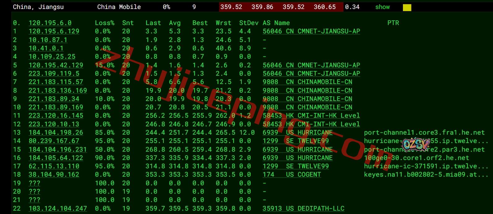 移动去程:直连移动德国法兰克福节点,然后经过法国再去美国弗吉尼亚州,再到迈阿密