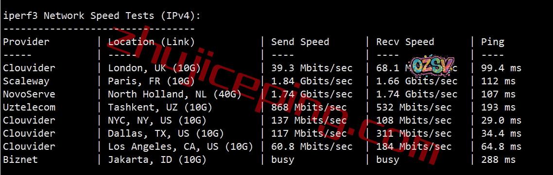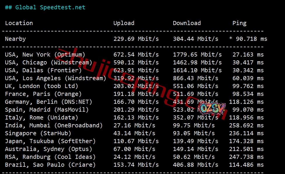 speedtest的部分国际节点的测试数据: