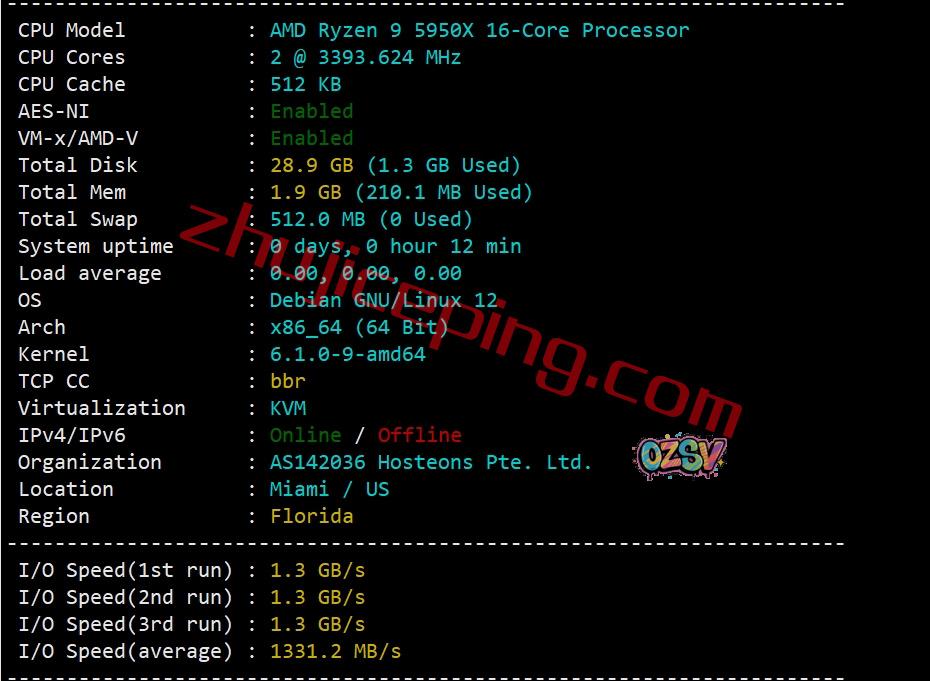 CPU为AMD Ryzen 9 5950X,这里选的是2G内存这款VPS做测试,启用了BBR,hosteons自己的AS,归属地迈阿密,当前硬盘I/O大致1331MB/S: