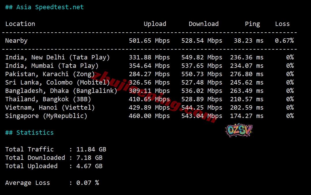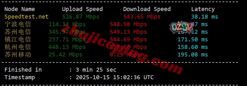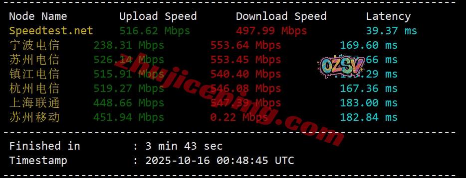 SpeedTest.Net的部分亚洲节点的带宽上下行和延迟测试数据: