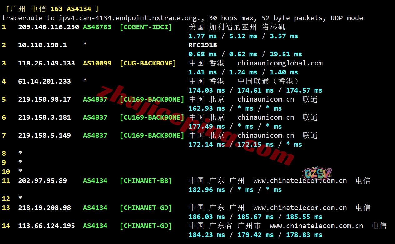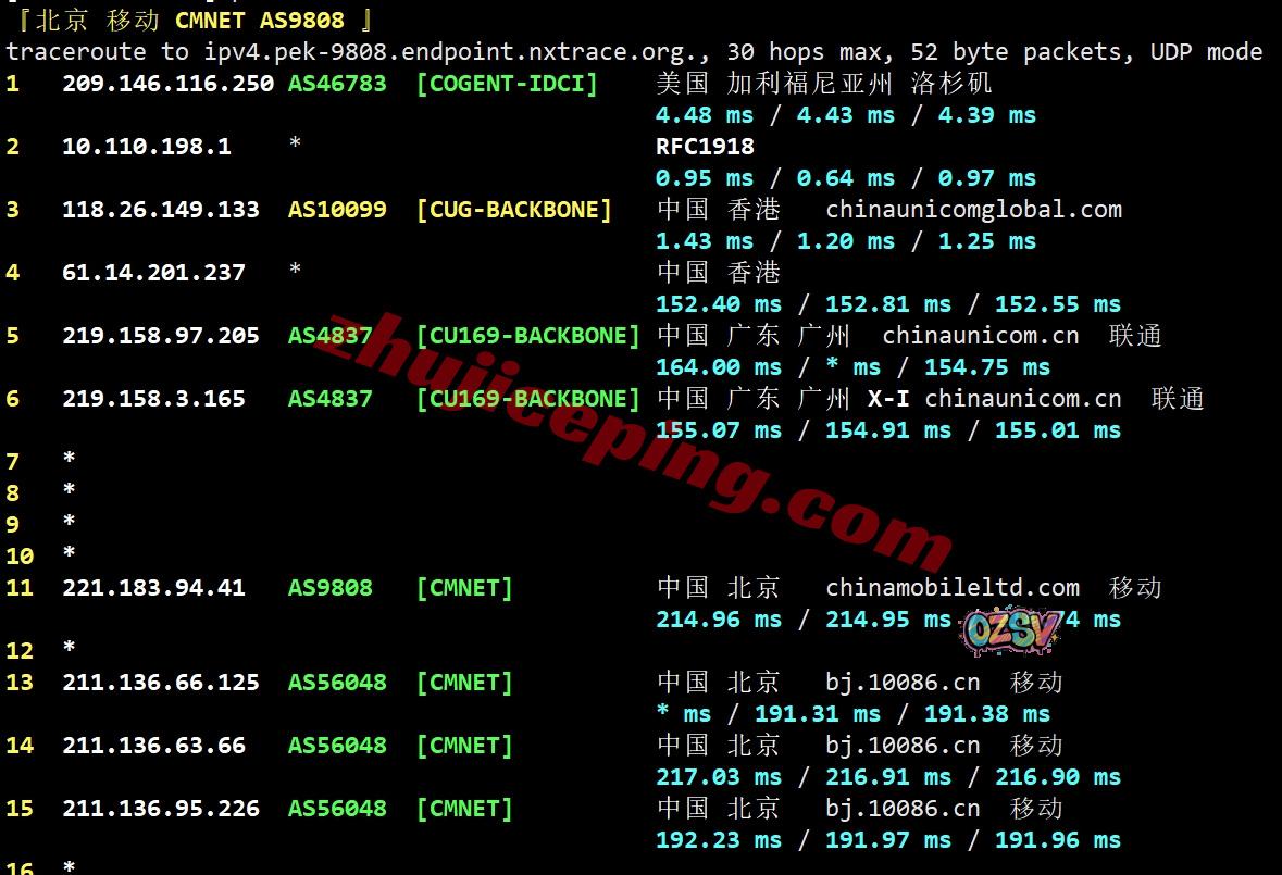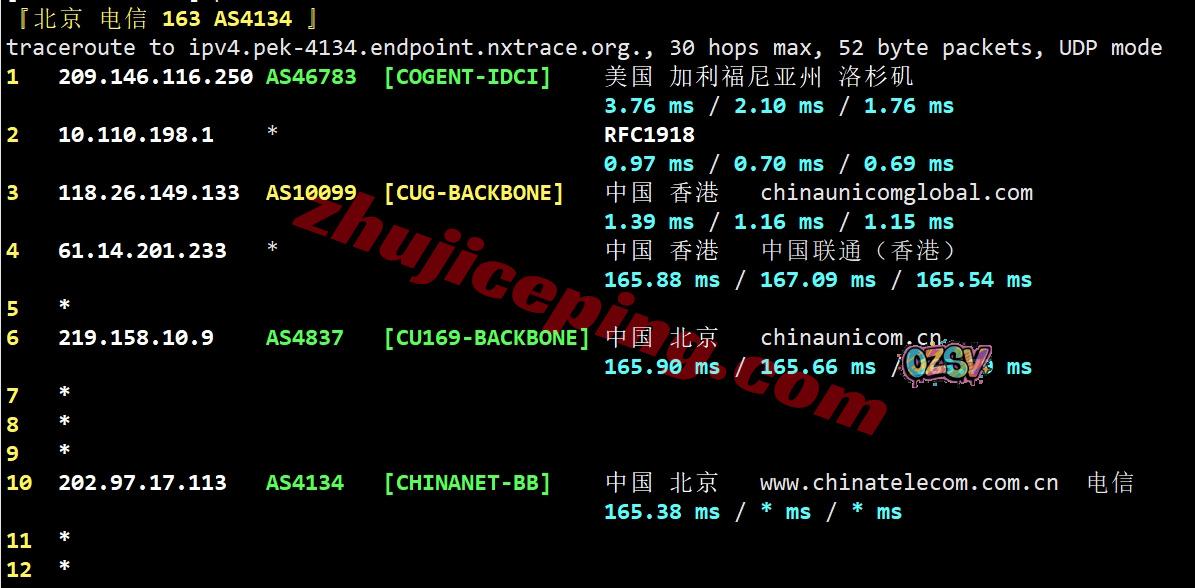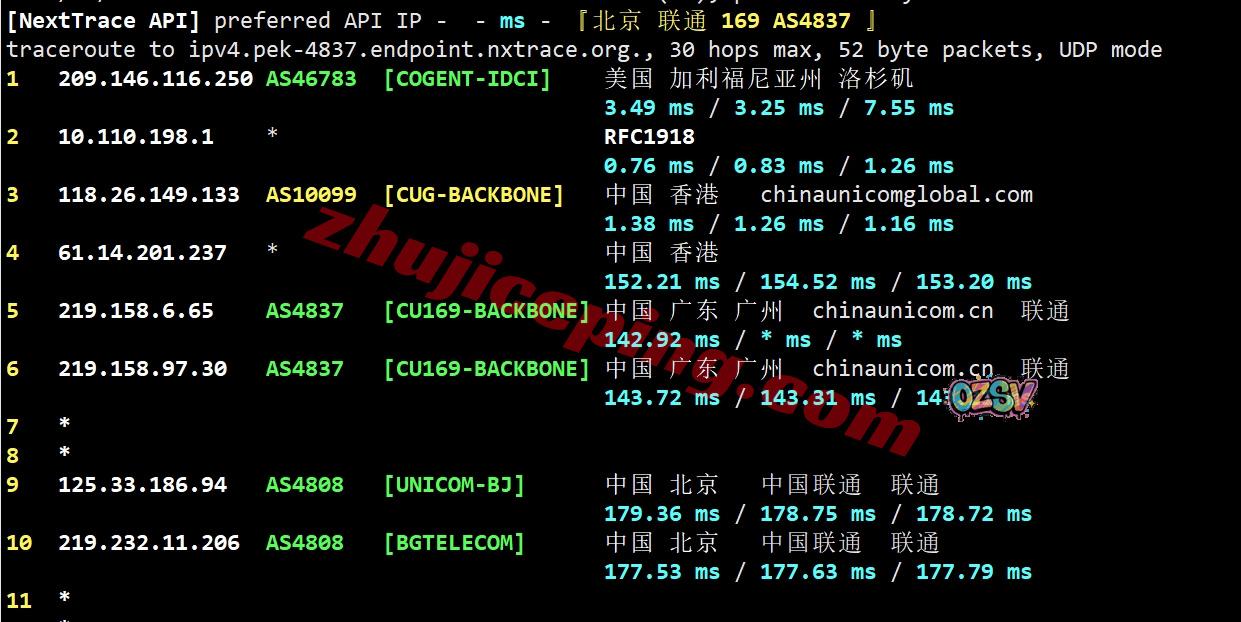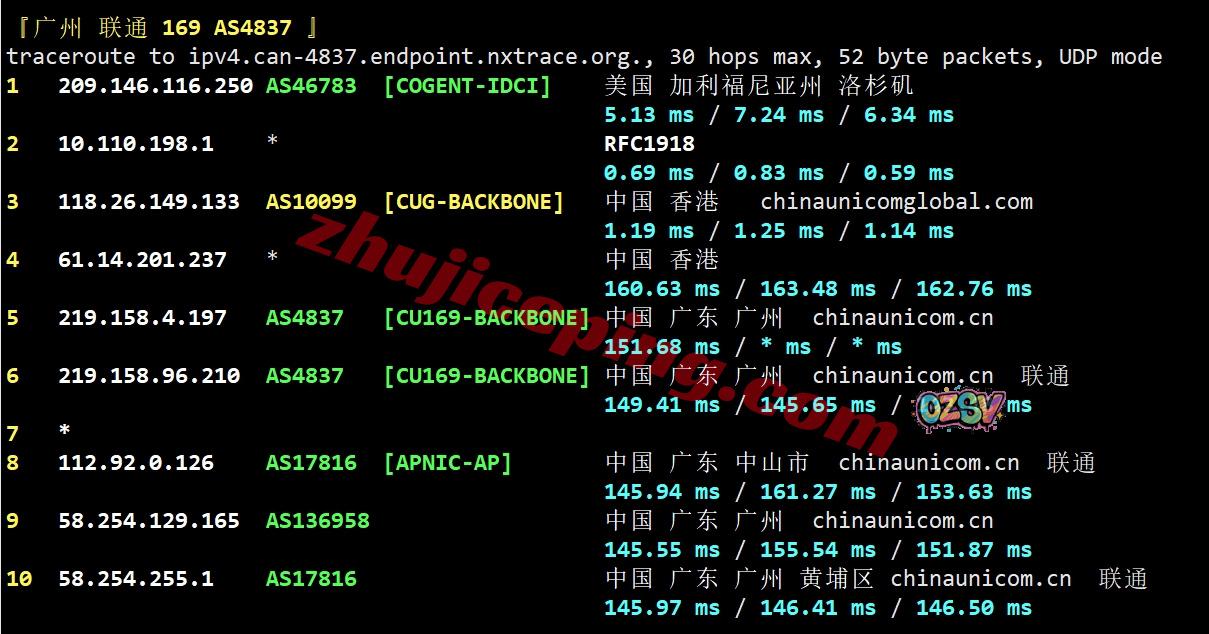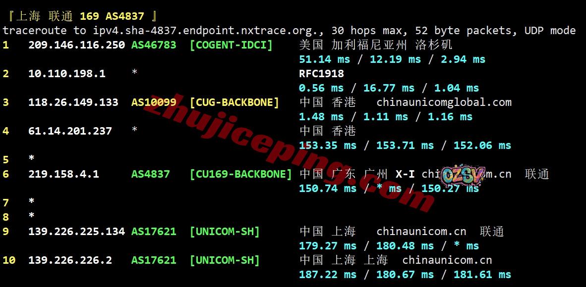 联通回程:走联通AS10099国际段到香港再接AS4837回内地