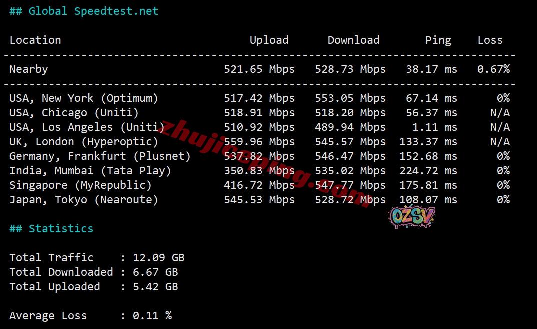 SpeedTest.Net的部分国际节点的带宽上下行和延迟测试数据: