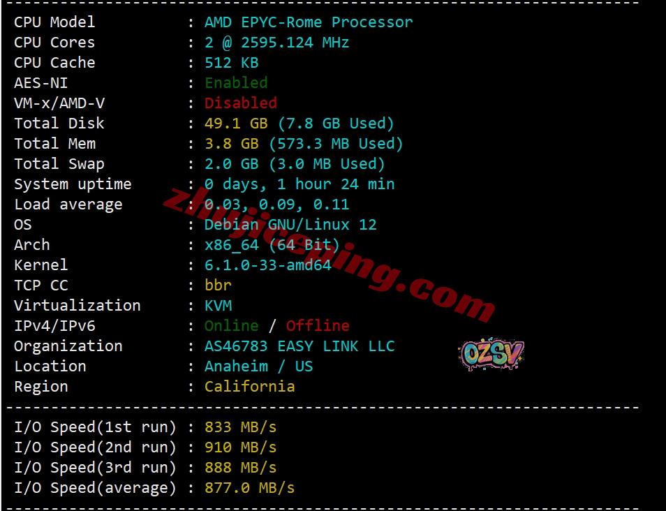 服务器使用的CPU为AMD EPYC 7002,具体型号未知,主频2595.124MHz;云服务器底层为KVM虚拟,站长启用了BBR,不支持IPv6,网络提供商AS46783实际就是vmrack自己,归属地显示为anaheim(属于大洛杉矶地区的卫星城),当前实测I/O大致在877MB/S: