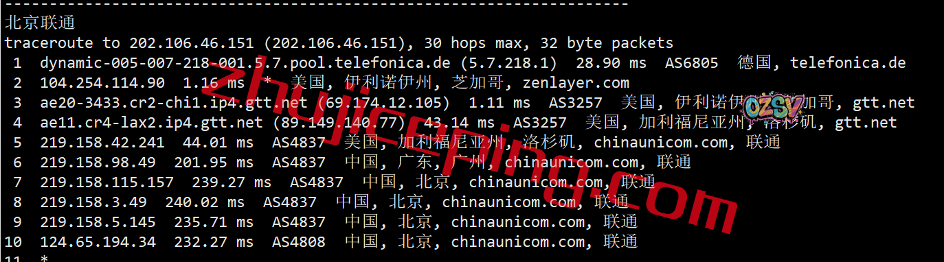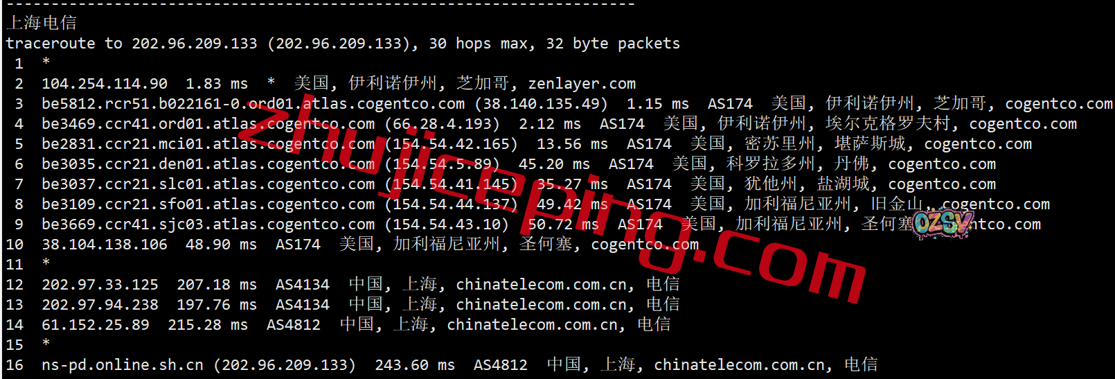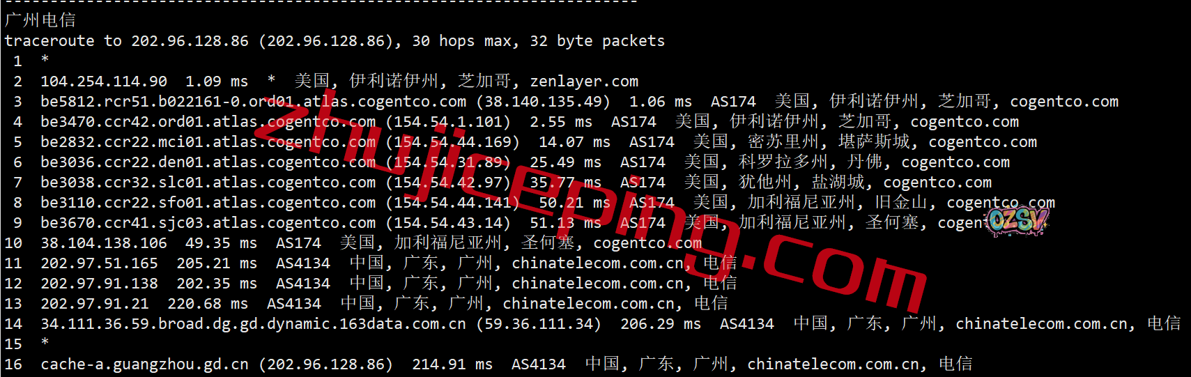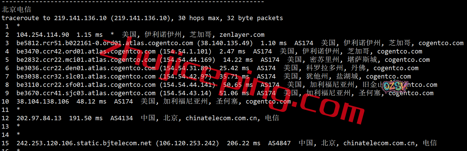 回程,到国内电信:一路走cogentco从圣何塞出口对接电信骨干
