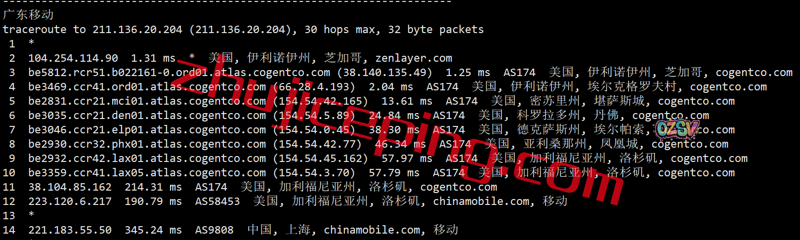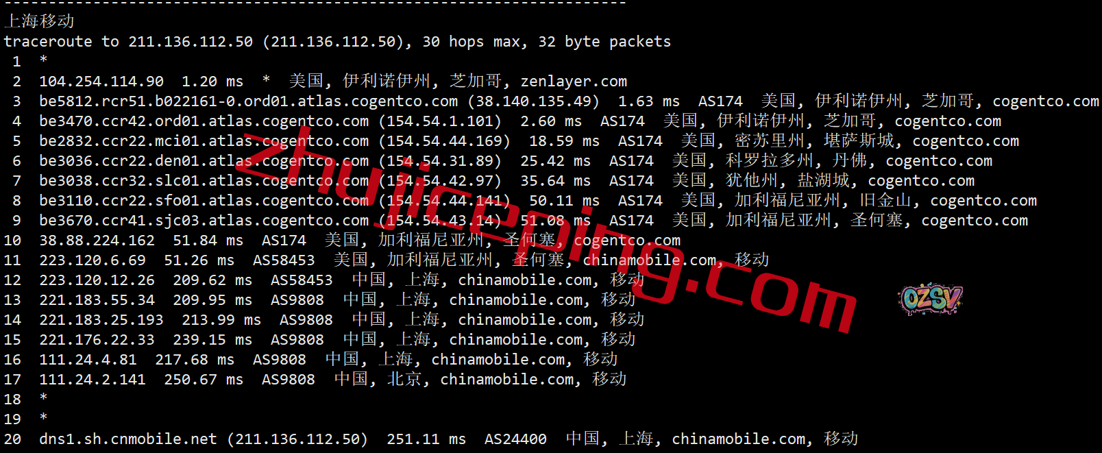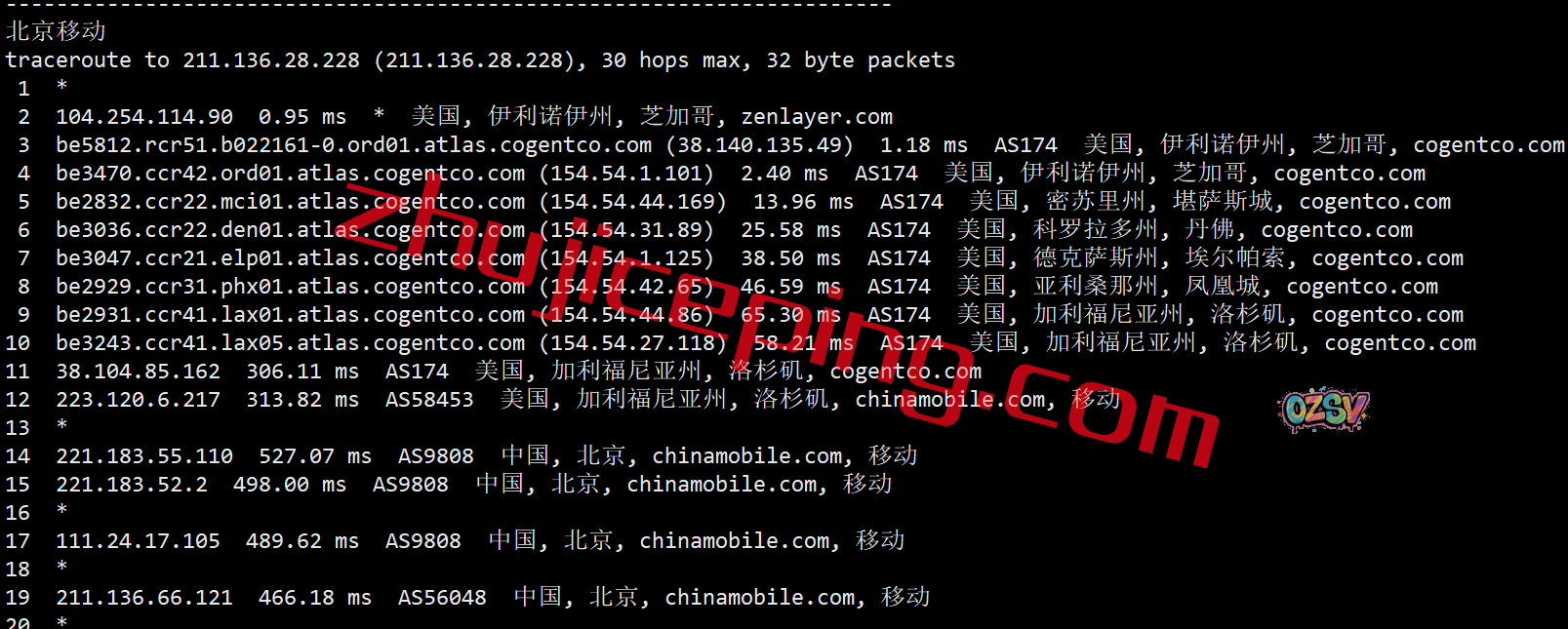 回程,到国内移动:一路cogentco到洛杉矶之后走移动在洛杉矶的节点直连回来