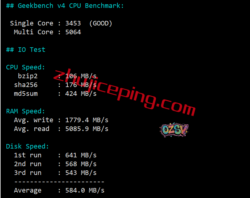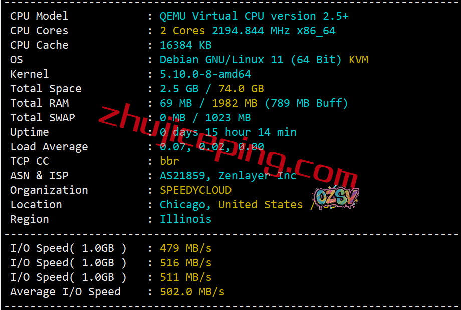 主频2.2GHz,本次测试用的最低配,给了2核,开启了BBR,zenlayer自己的广播IP,当前硬盘I/O大致在502MB/S的样子: