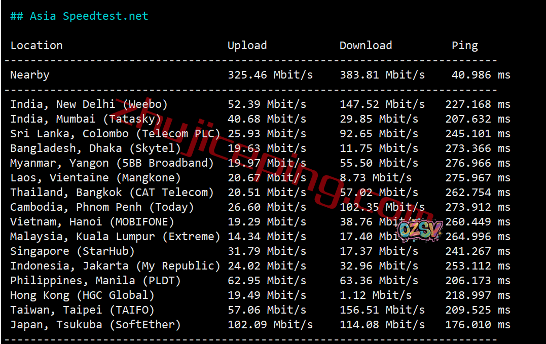 继续测试speedtest亚洲区域内的部分节点,看看数据: