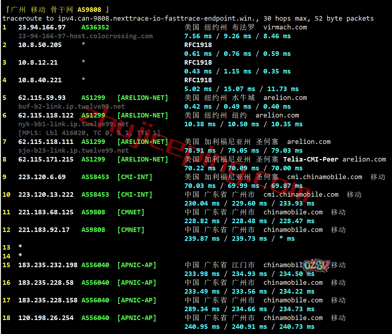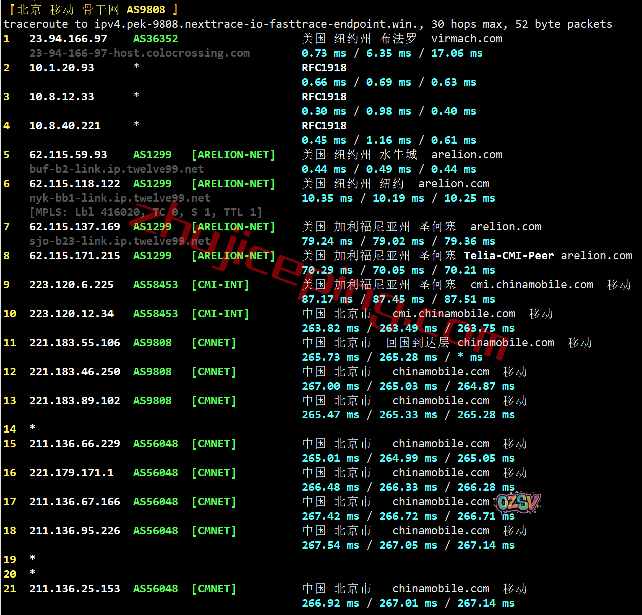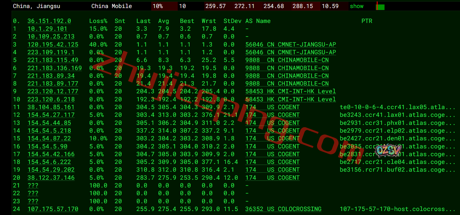 移动去程:直连移动洛杉矶节点然后走cogent去纽约