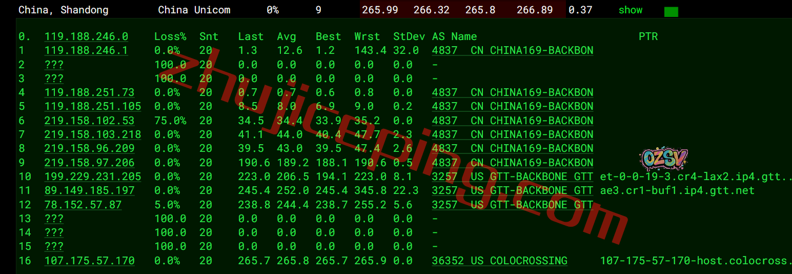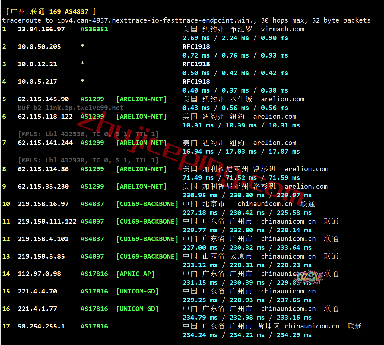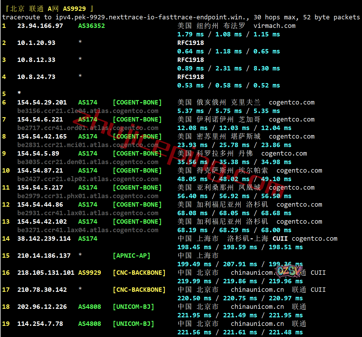 联通去程:直连联通洛杉矶节点然后走GTT去纽约
