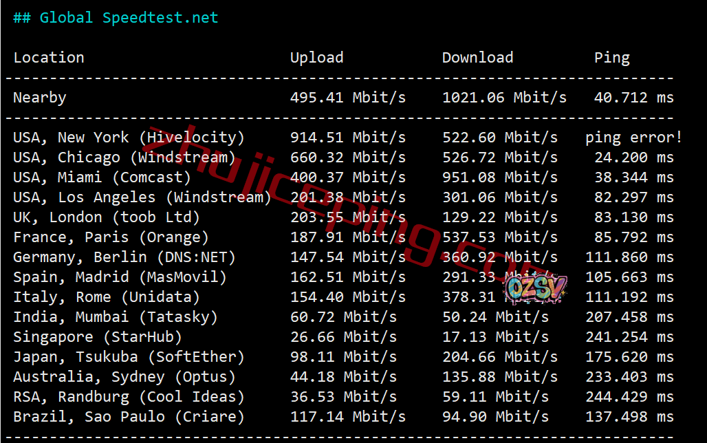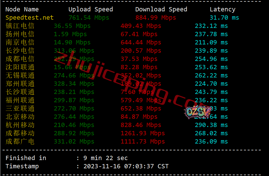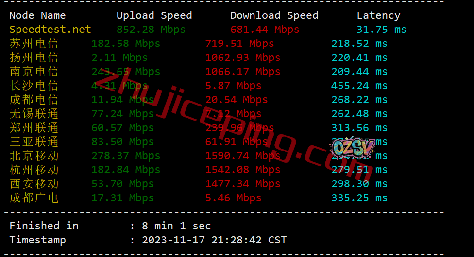 先跑一圈speedtest,看看国内三网多节点的上下行带宽可以冲到多少: