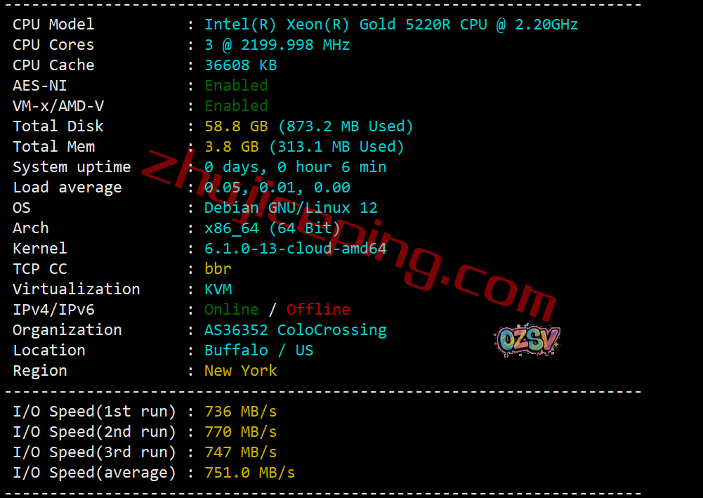 本次纽约机房的特价促销货用的是Gold 5200R(24核、48线程、主频2.2GHz、加速频率4.0GHz),不支持IPv6,当前硬盘I/O大致751MB/S: