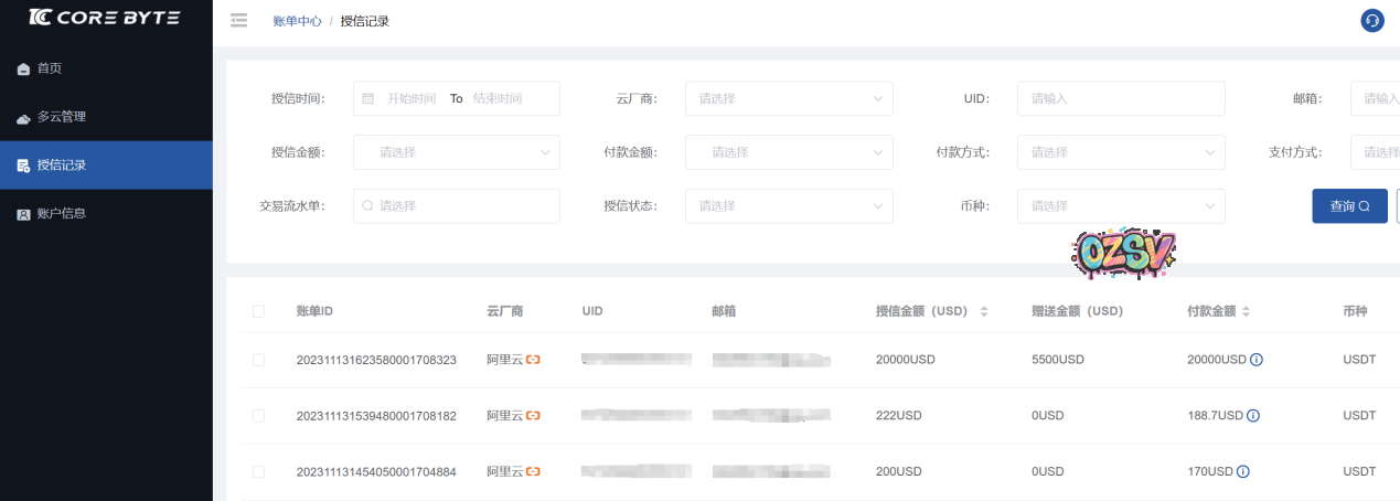 付款后,客户可以通过个人后台查询到授信记录,平台还支持自助余额转移、余额预警等,更方便客户管理自己的云账号。