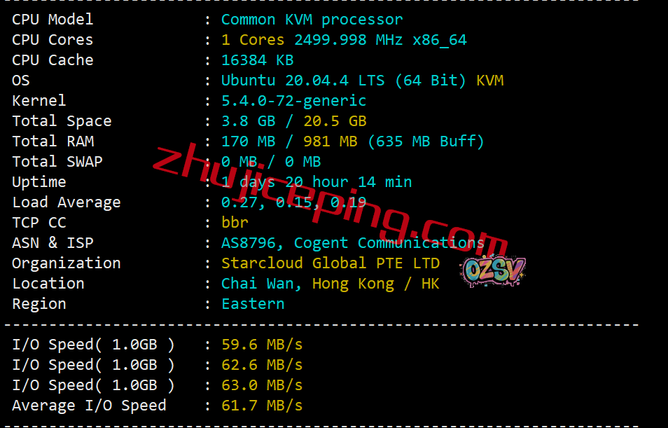 性能方面从测试来看CPU挺靠谱,但是硬盘I/O被官方限制得死死的不过也足够大家用了,一般的建站等用途给60MB/S根本用不完。