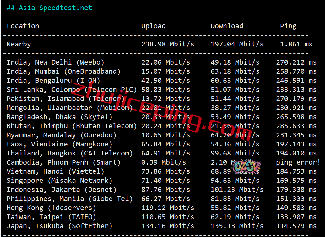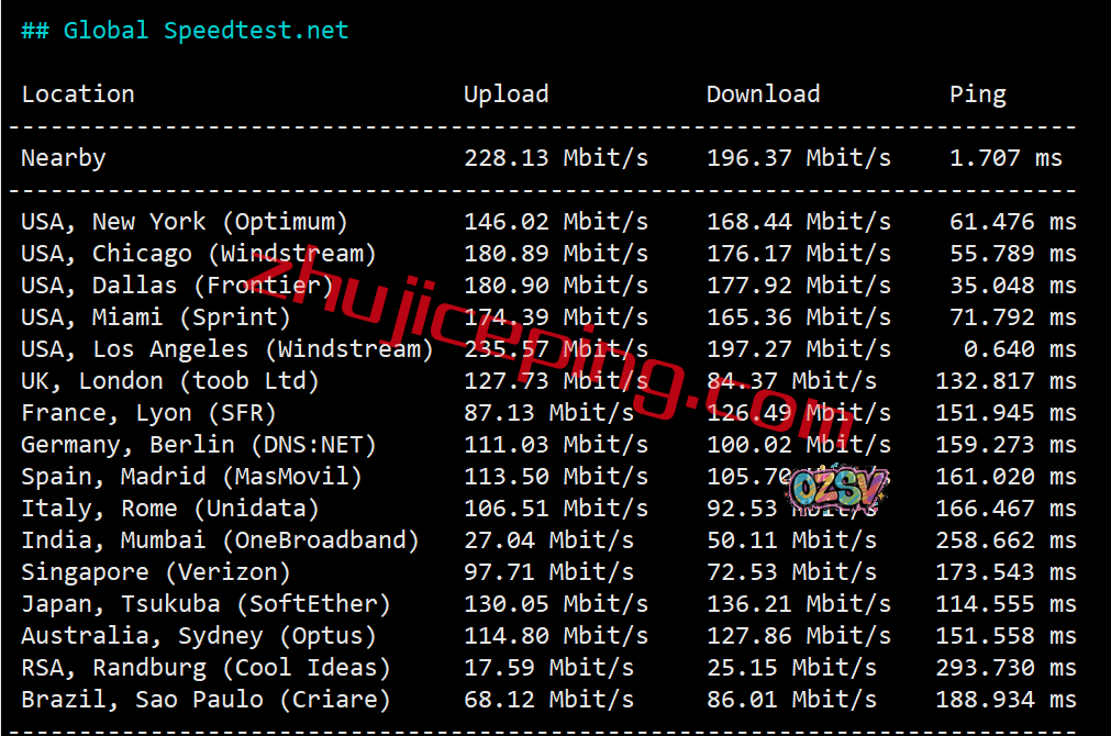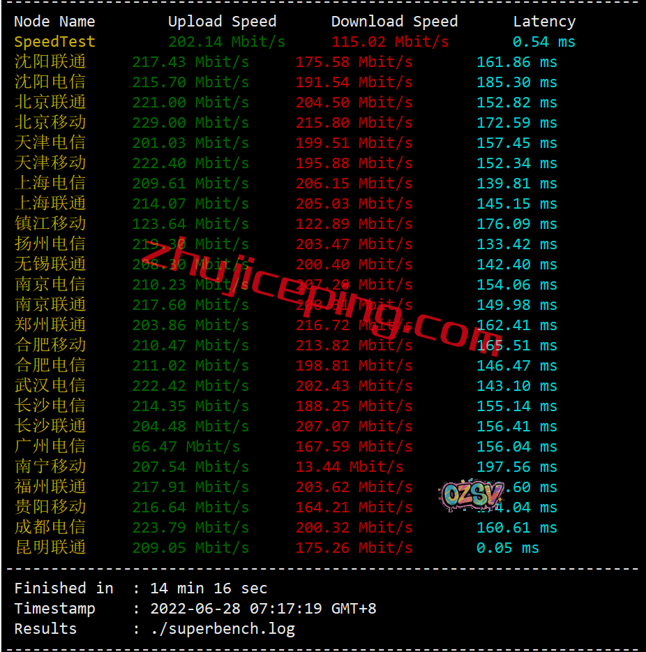最低配的VPS给的是200Mbps带宽,我们用speedtest.net在国内三网的节点跑一下看看,上行和下行能跑多少?如下: