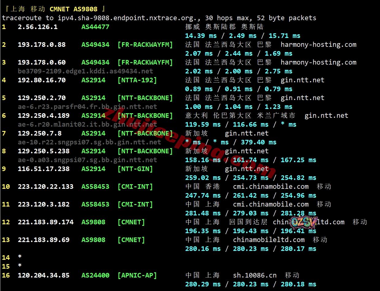 上海方向:走NTT经过意大利去新加坡再经过香港CMI节点回内地