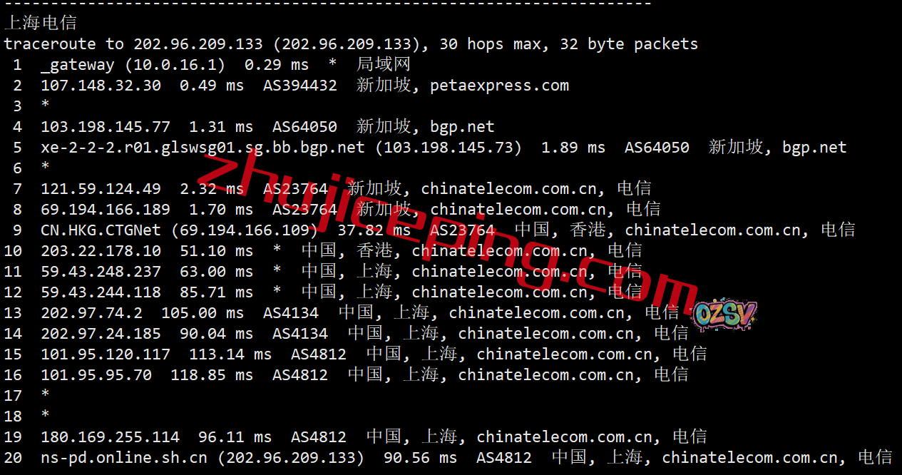 回程,到国内电信:从电信新加坡节点出来到电信香港节点然后直达内地