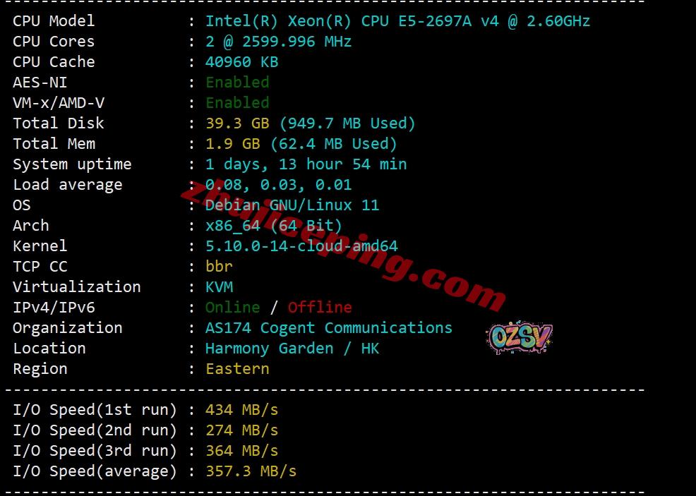 服务器用的CPU型号为e5-2697A V4(如果是双路,那就是32核、64线程、主频2.6GHz、加速频率3.6GHz),启用了BBR,由于开测试机的时候我没有勾选IPV6所以这里显示的是不支持IPv6(实际上是支持的),cogent的AS号,归属地香港,当前I/O大致357MB/S: