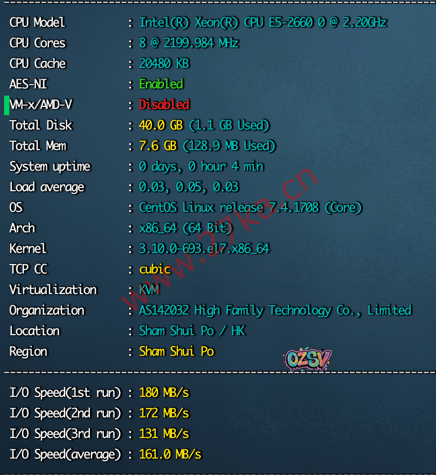 站长弄了一台香港双程CN2的云服务器,官方说的是5Mbps香港双程CN2带宽。拿到机器,CPU为E5-2660,测试硬盘I/O在180MB/s的样子: