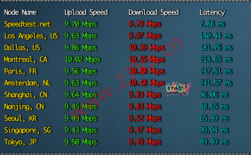 官方网站上面写的是默认是10Mbps带宽,我们直接用speedtest.net在中国大陆的三网的节点来做个带宽的上下行测试,看看可以跑到多少。数据如下,上行是10Mbps,下行是10Mbps: