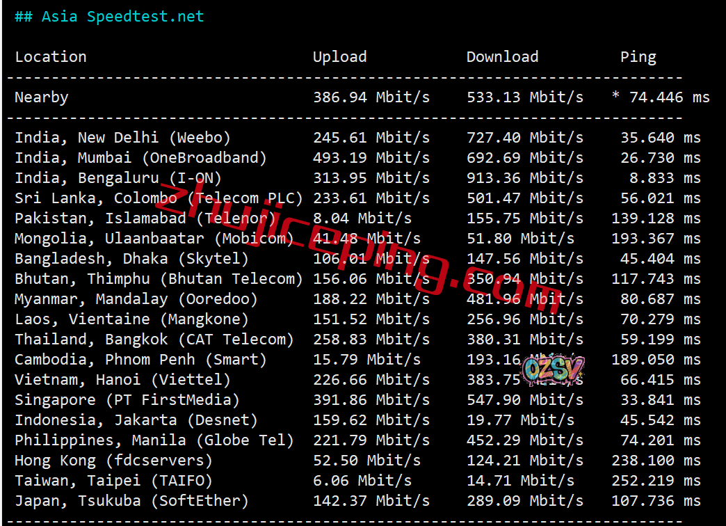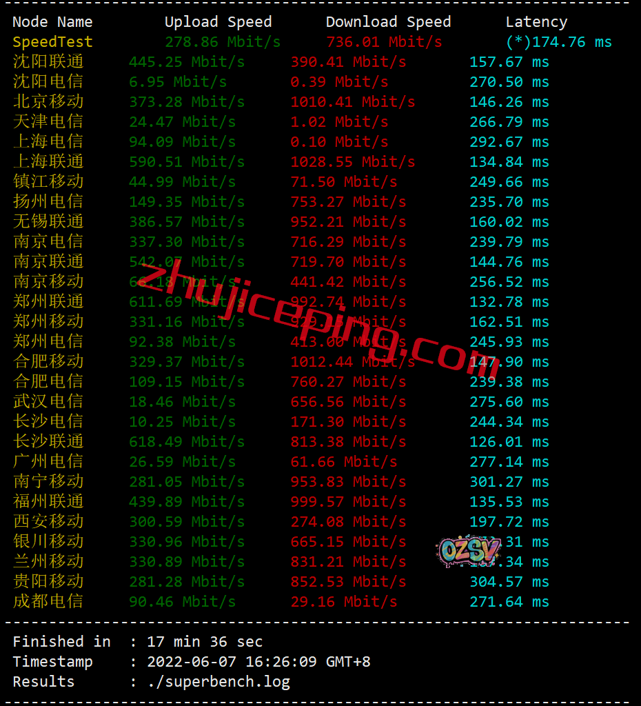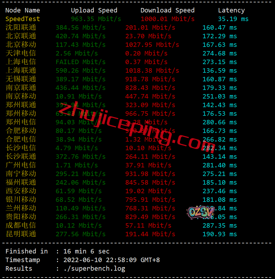 我们用国内三网的不同speedtest的节点来跑一下,看看不同节点能跑到多少的上行和下行带宽?大致结果如下: