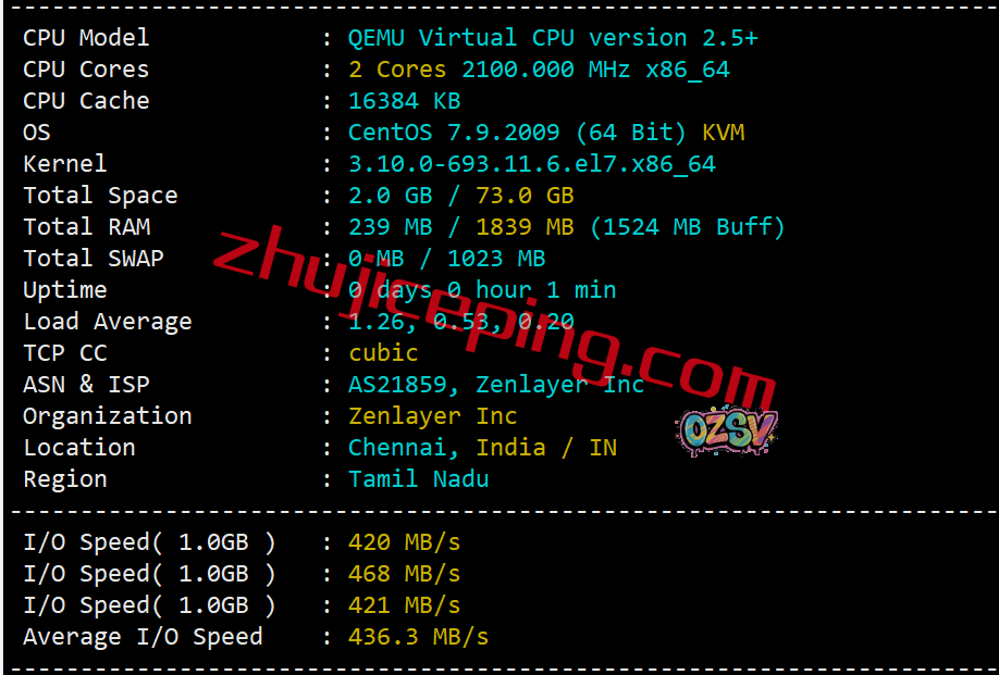 本次测试依旧选择的是最低配的云服务器,2.1GHz的主频,zenlayer自己的IP广播到印度机房,当前硬盘大致I/O在436MB/S的样子: