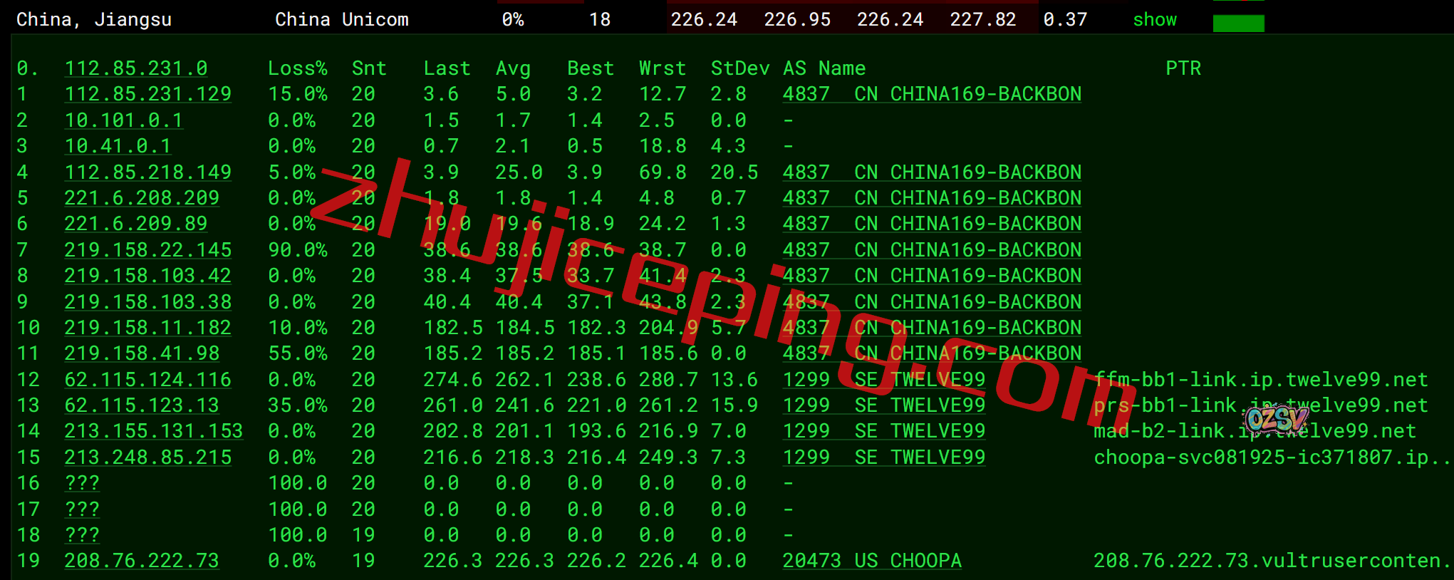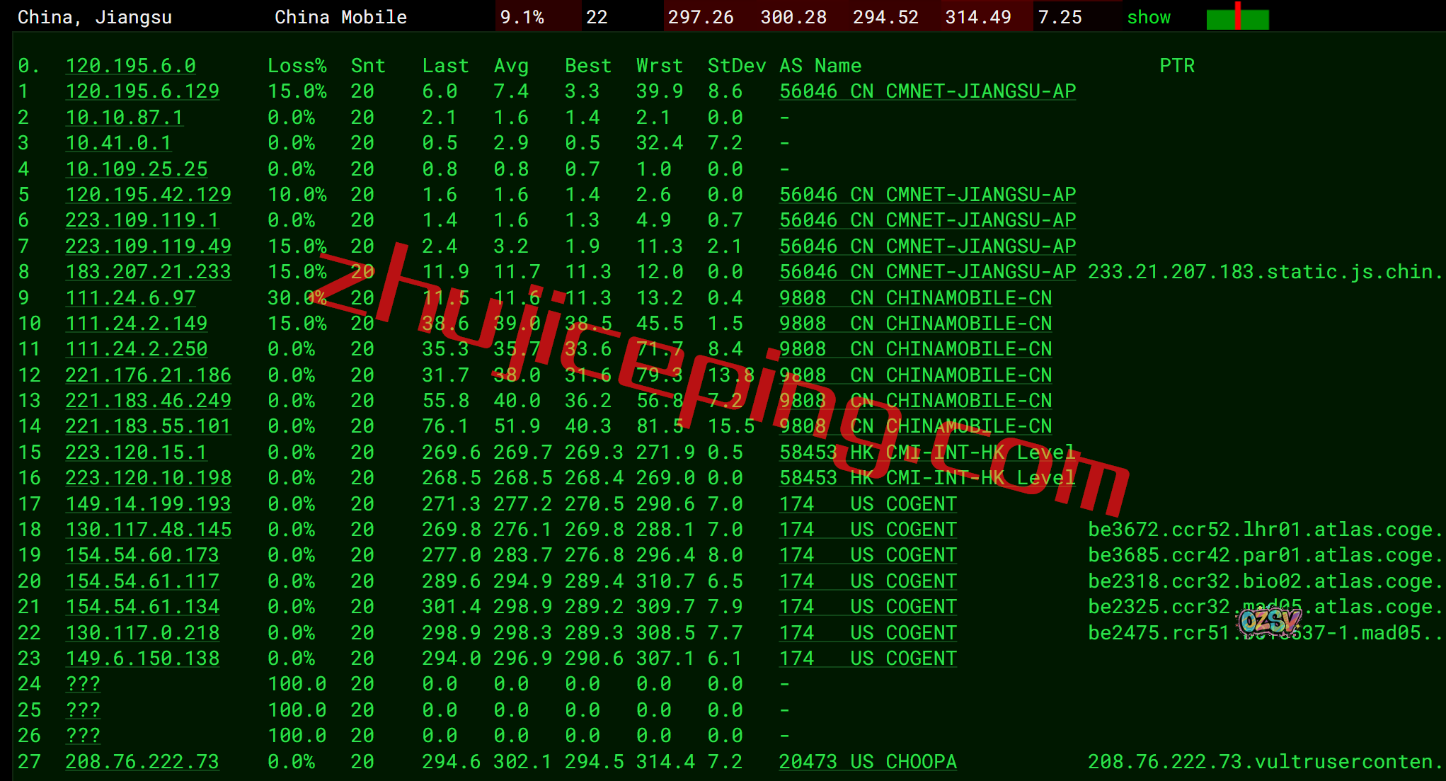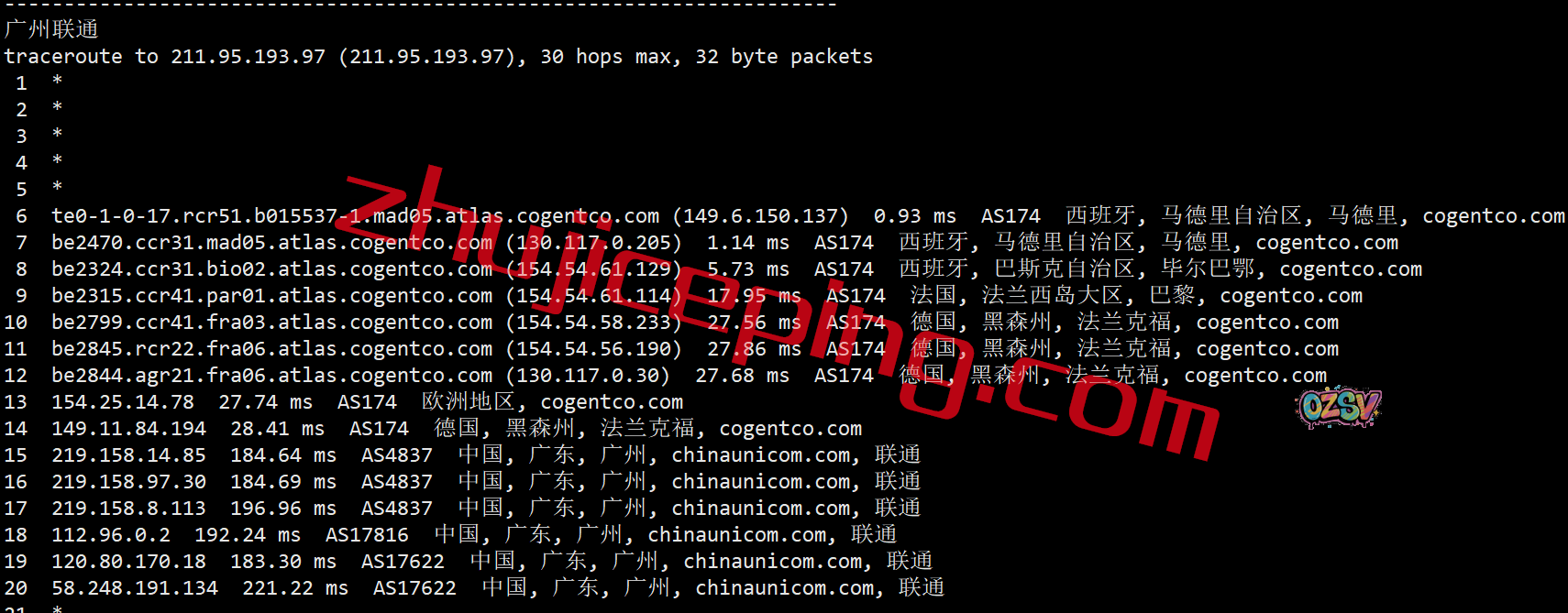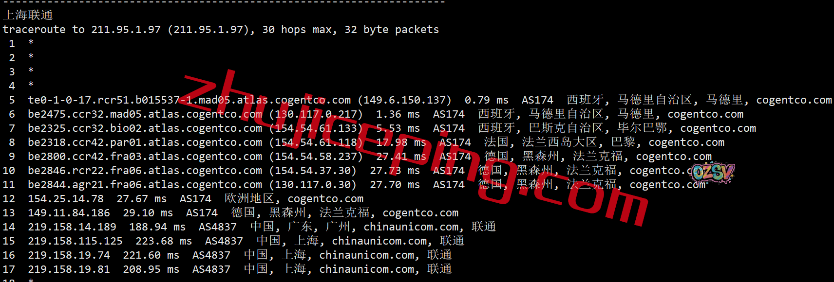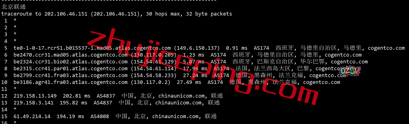 回程,到国内联通:全部走cogent到德国法兰克福,然后对接联通AS4837骨干