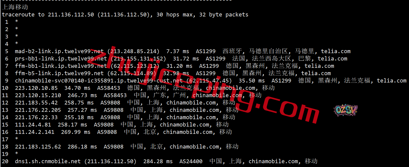 上海方向:走telia到德国法兰克福,然后转移动在德国法兰克福的节点直连回来