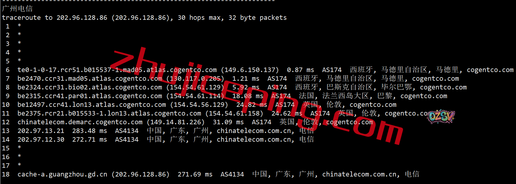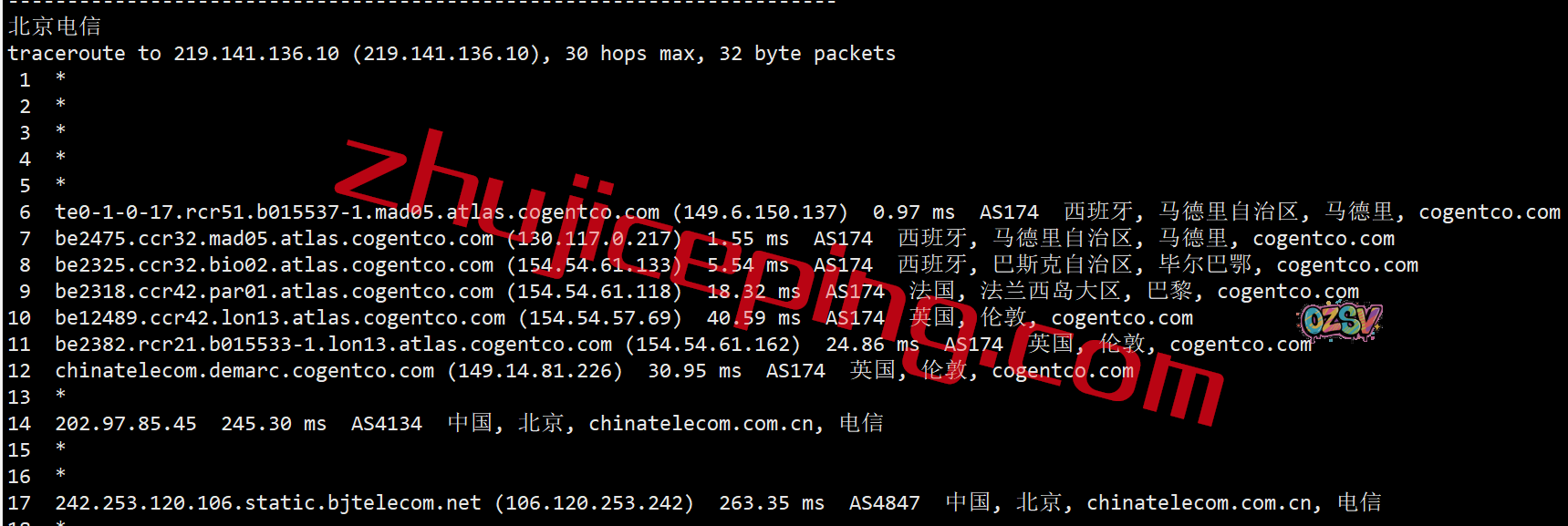 回程,到国内电信:全部走cogent线路到电信在cogent的伦敦接入点,然后对接电信骨干网