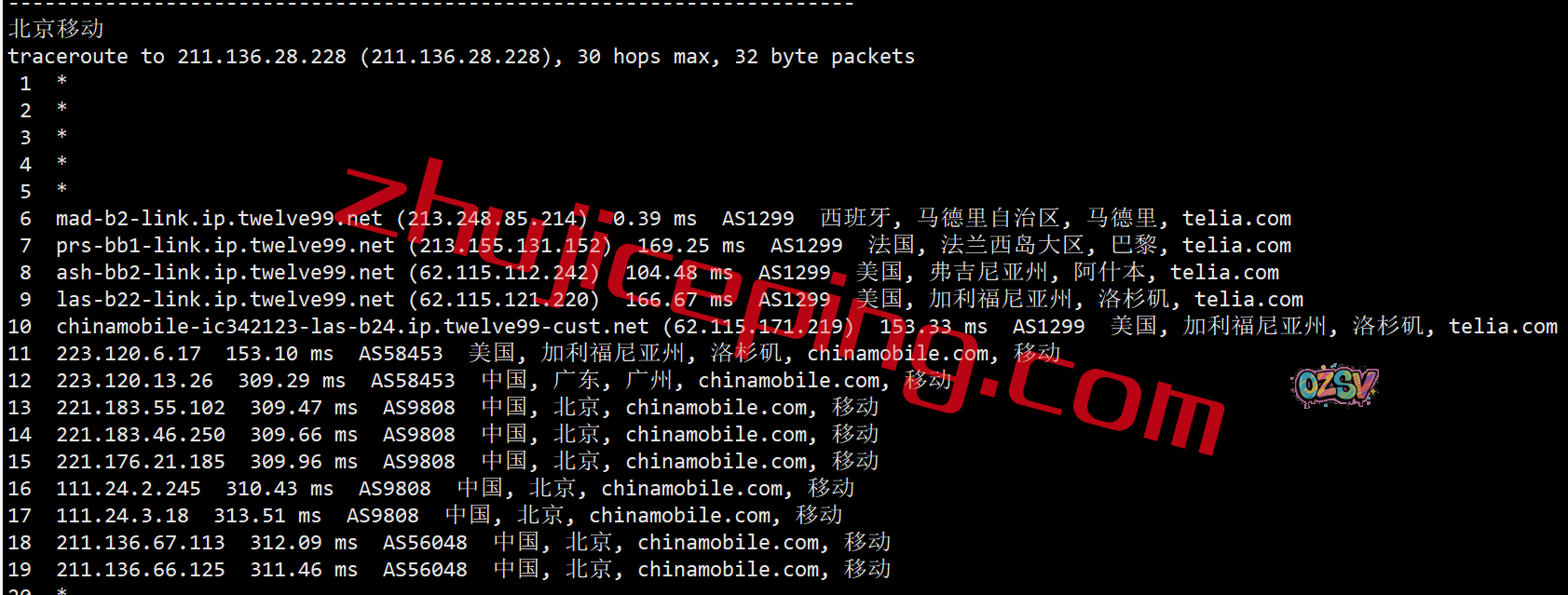 北京方向:走telia到美国洛杉矶,然后转中国移动在洛杉矶节点直连回来
