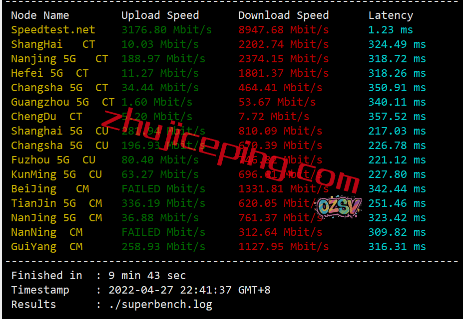 换个时间,晚高峰期间,我们再重新跑一次看看,下行带宽最高跑到8947Mbps,大致推测带宽至少有10Gbps: