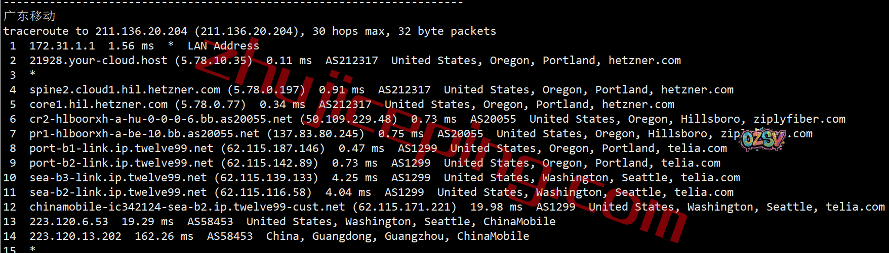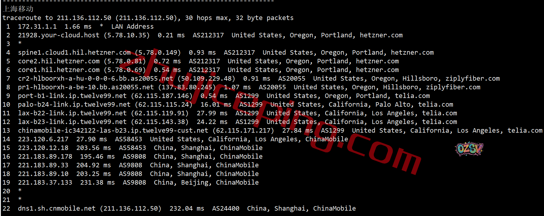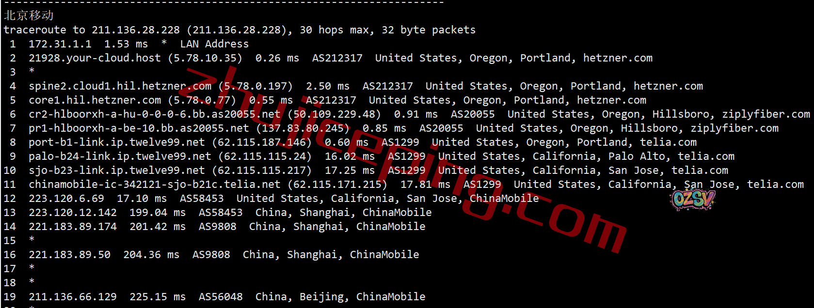 移动回程,走telia到圣何塞/洛杉矶,经过移动在圣何塞/洛杉矶的节点直连回国