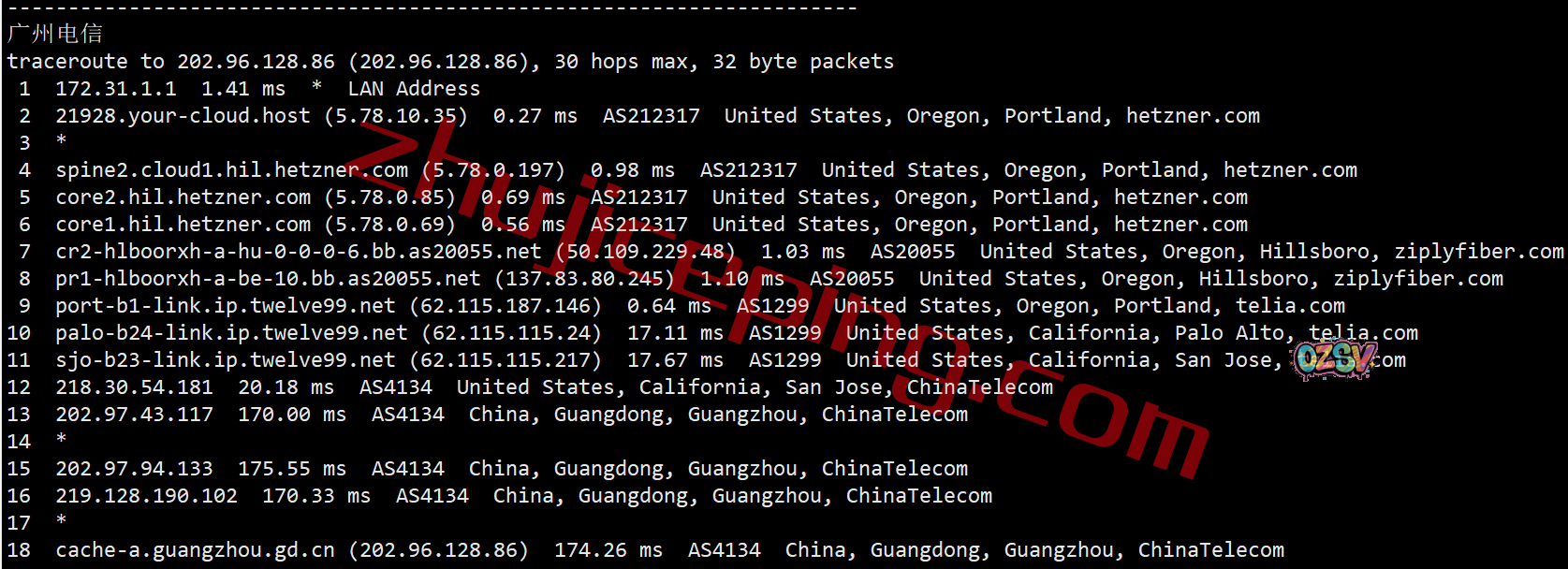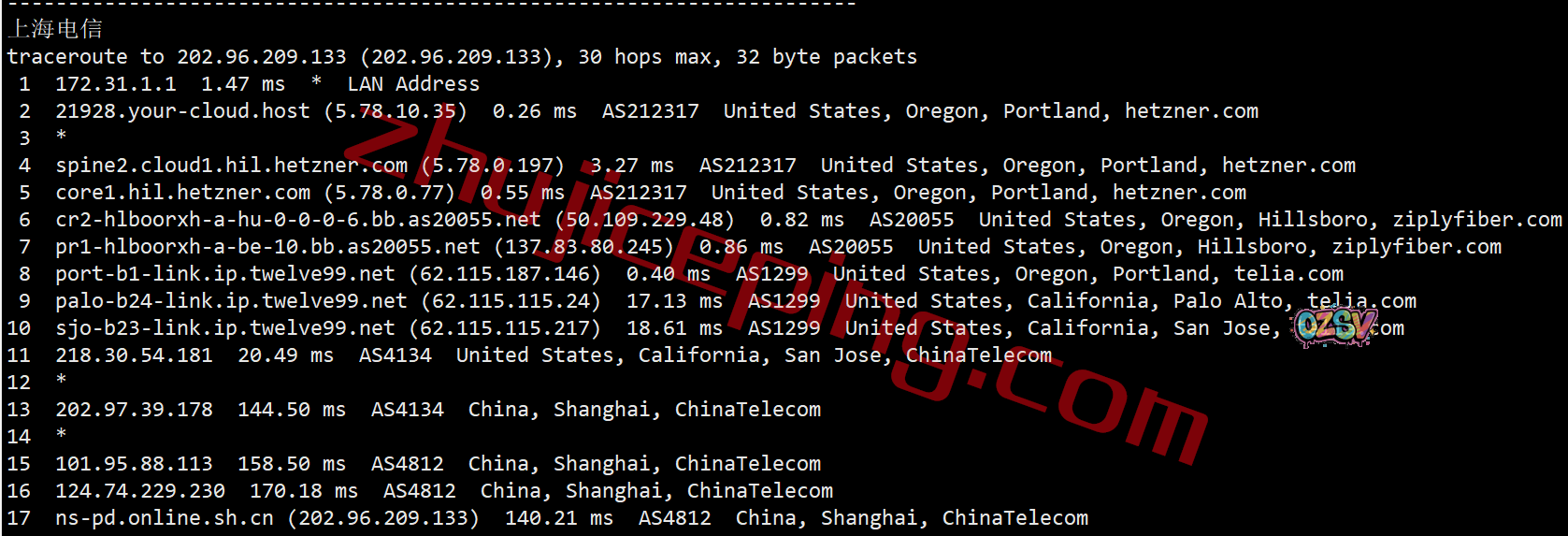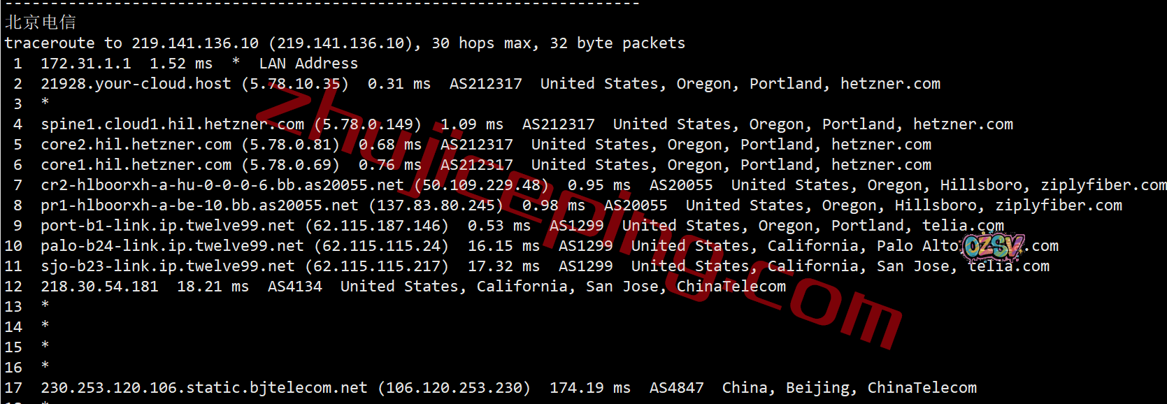 电信回程,走telia到圣何塞,经过电信圣何塞节点直连回国