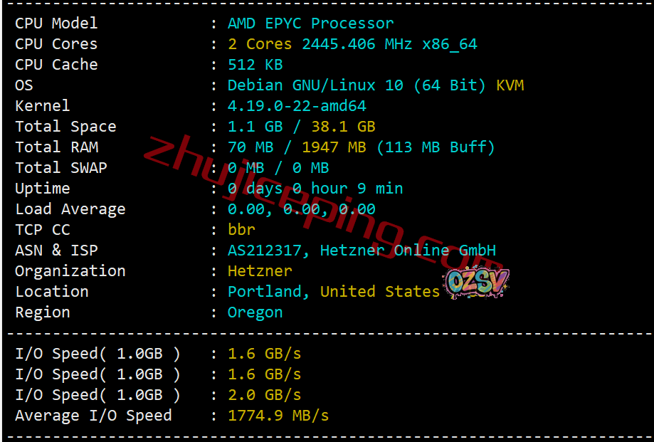 本次测试用的是最低配置,2G内存、2核、40G SSD、20T流量/月,3.85欧元/月,如果需要默认带IPv4那就是4.35欧元/月… CPU是amd epyc,这个主频不好猜是哪个型号… 站长默认启用了BBR,当前硬盘I/O大致1774MB/s…