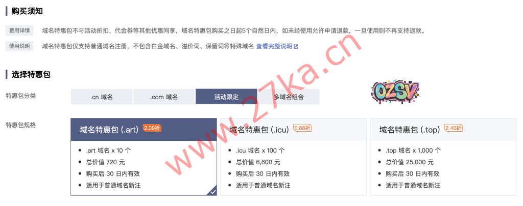 另外如果有其他偏门一点的预期需求还可以选择.art、.icu、.top域名特惠包!