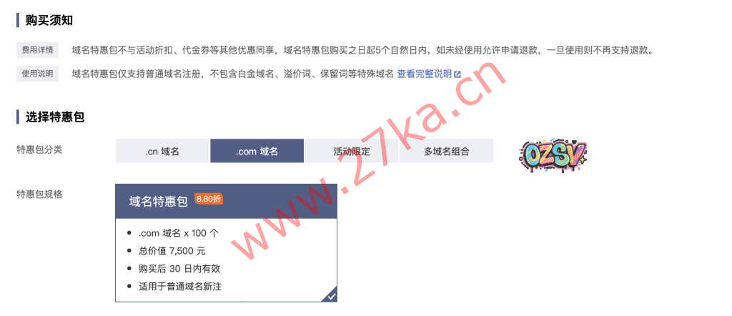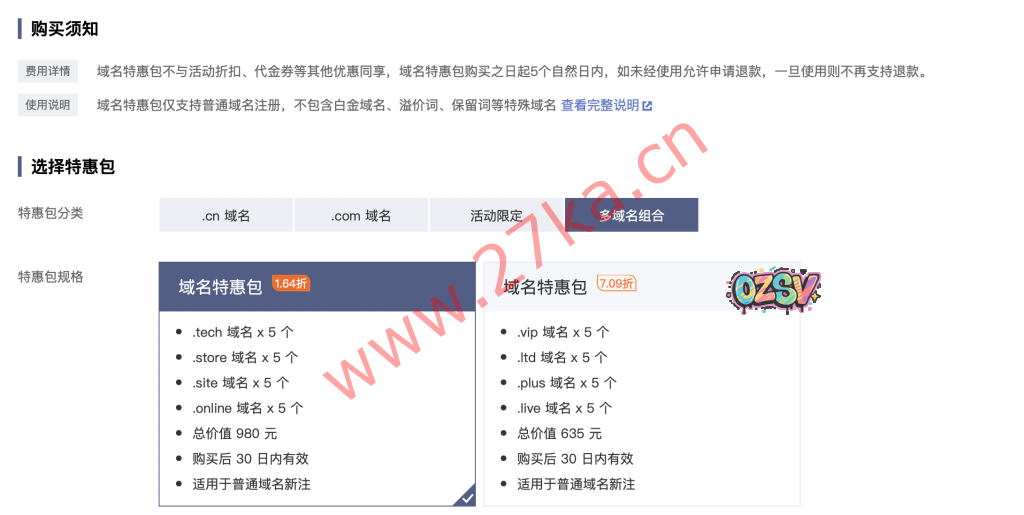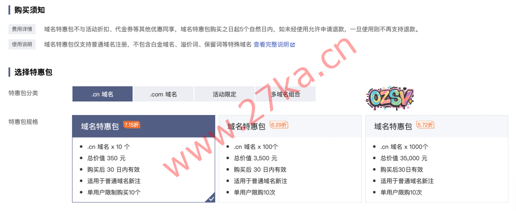 .cn域名特惠包有10个域名、100个域名、1000个域名三个特惠包,购买后有效期是30天。