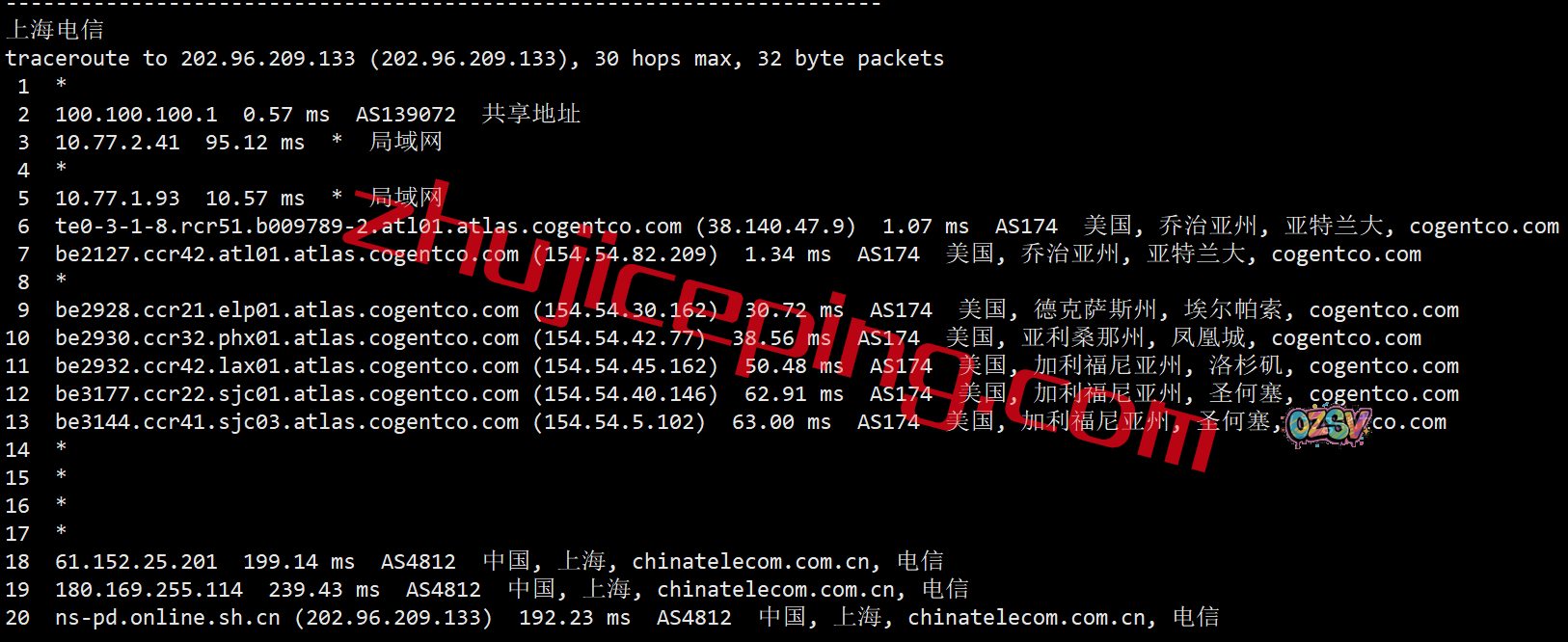 上海、广州方向:走cogent到圣何塞,然后接电信骨干